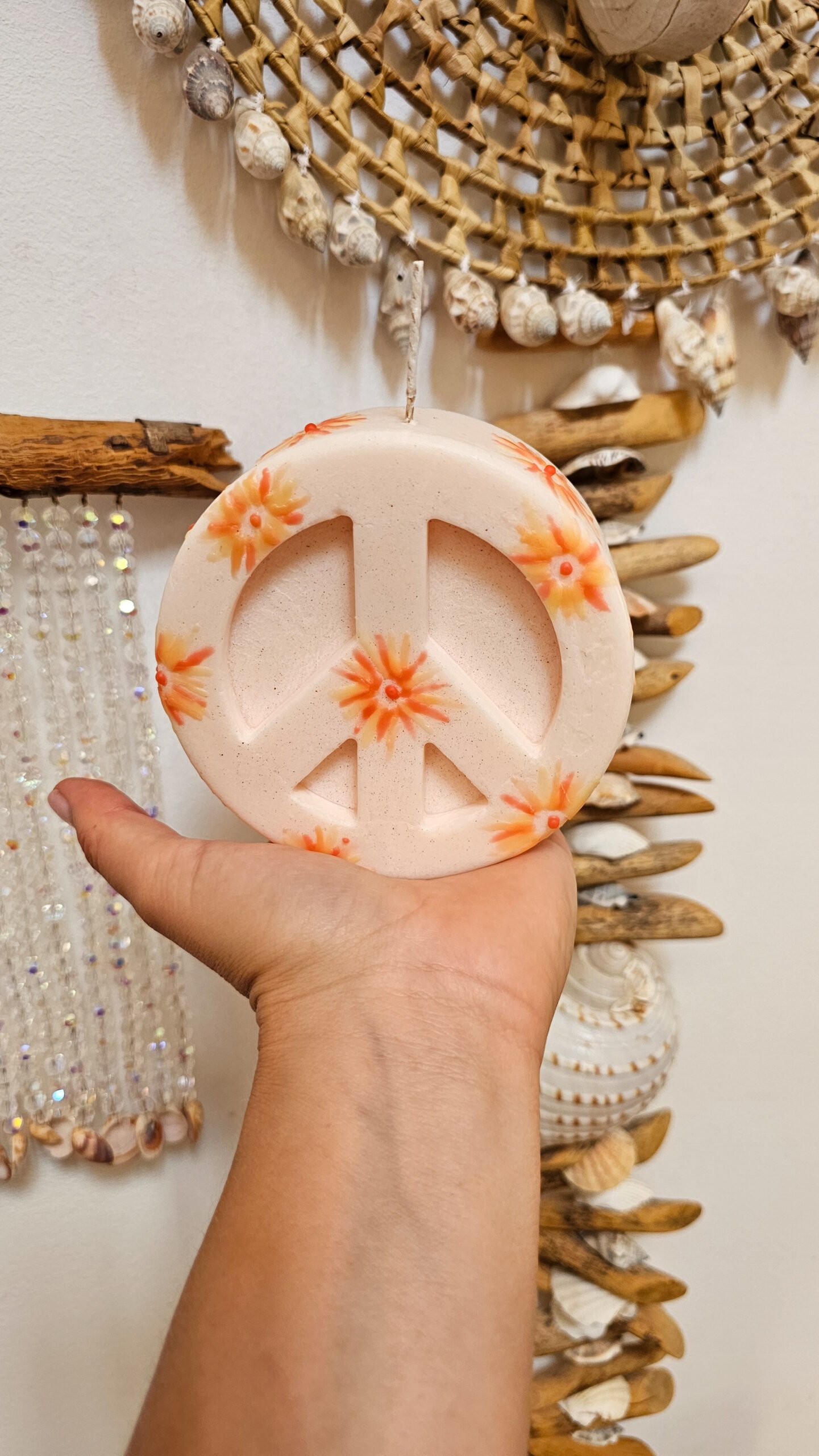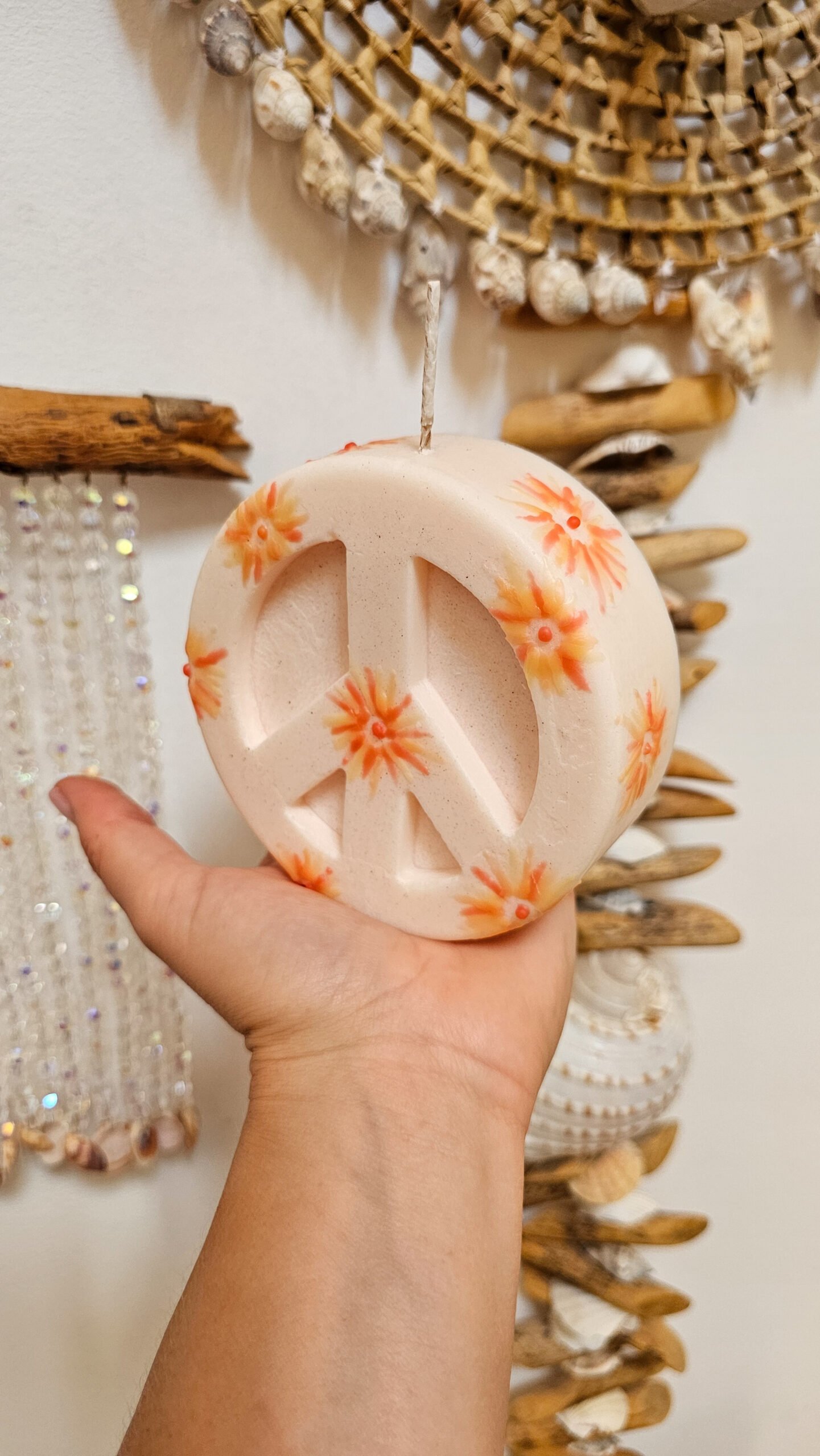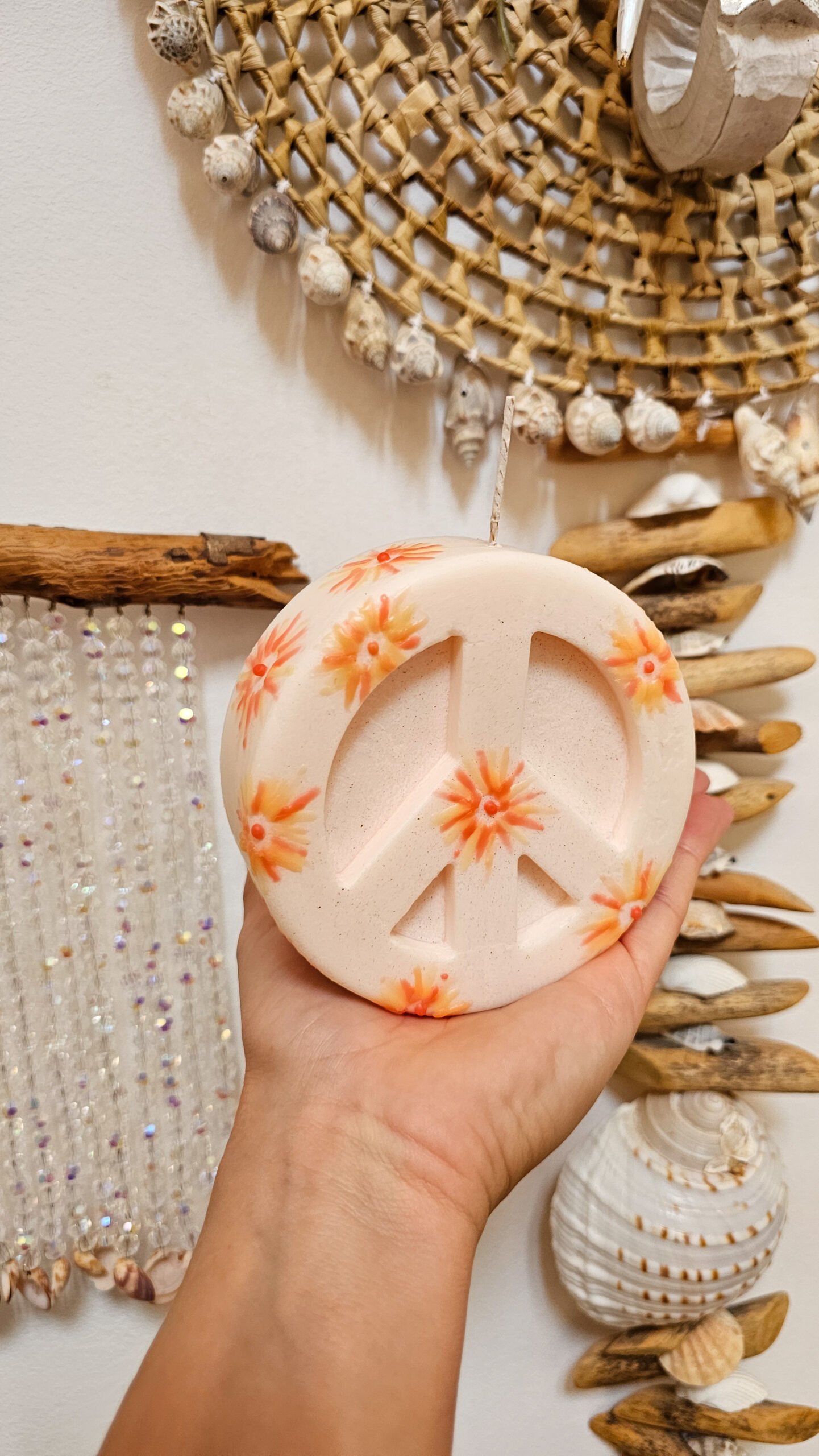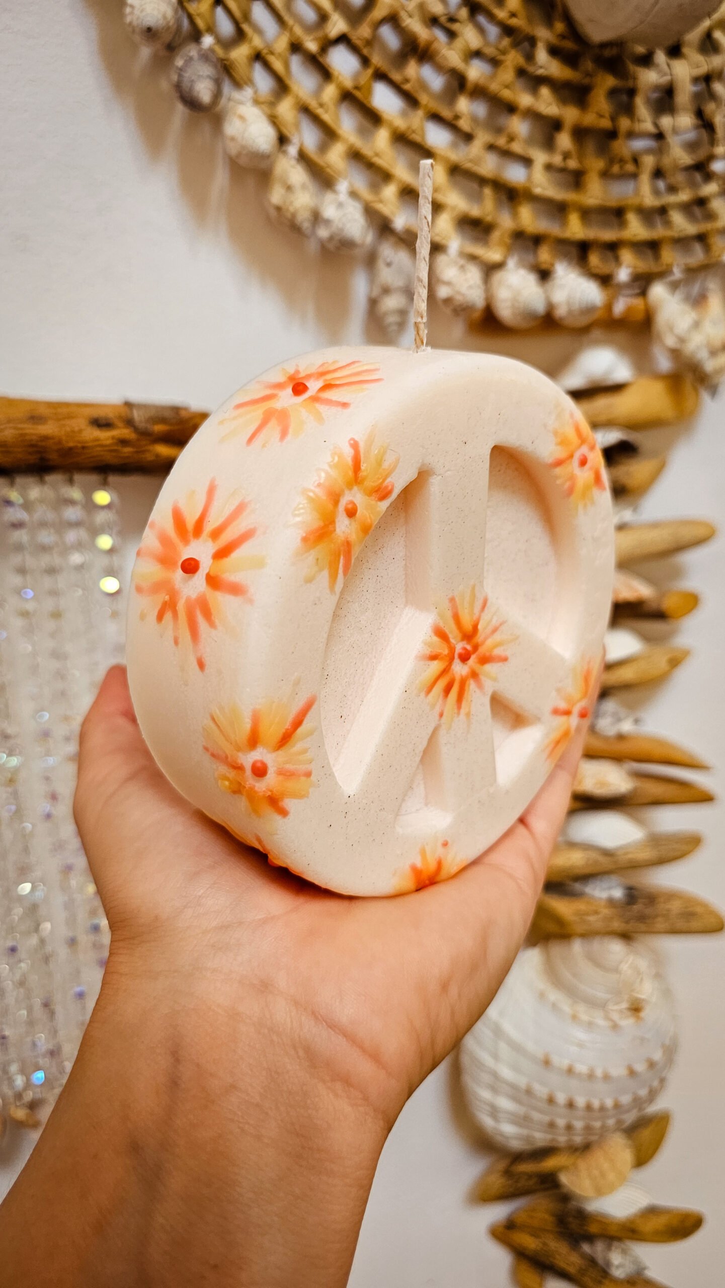 Bougies PEACE AND LOVE soleil en cire de soja, légèrement parfumée à la rose et peinte à la main.