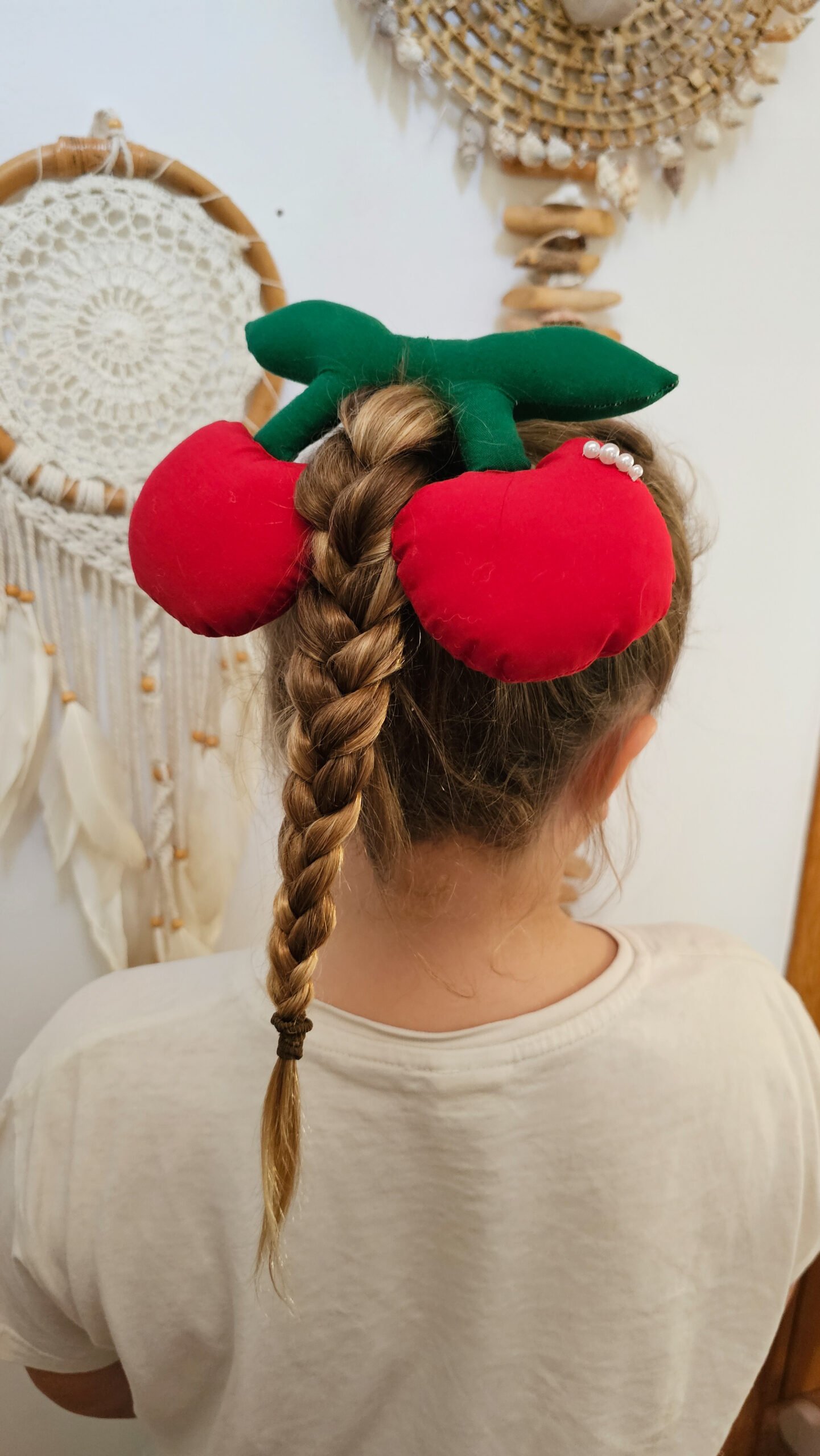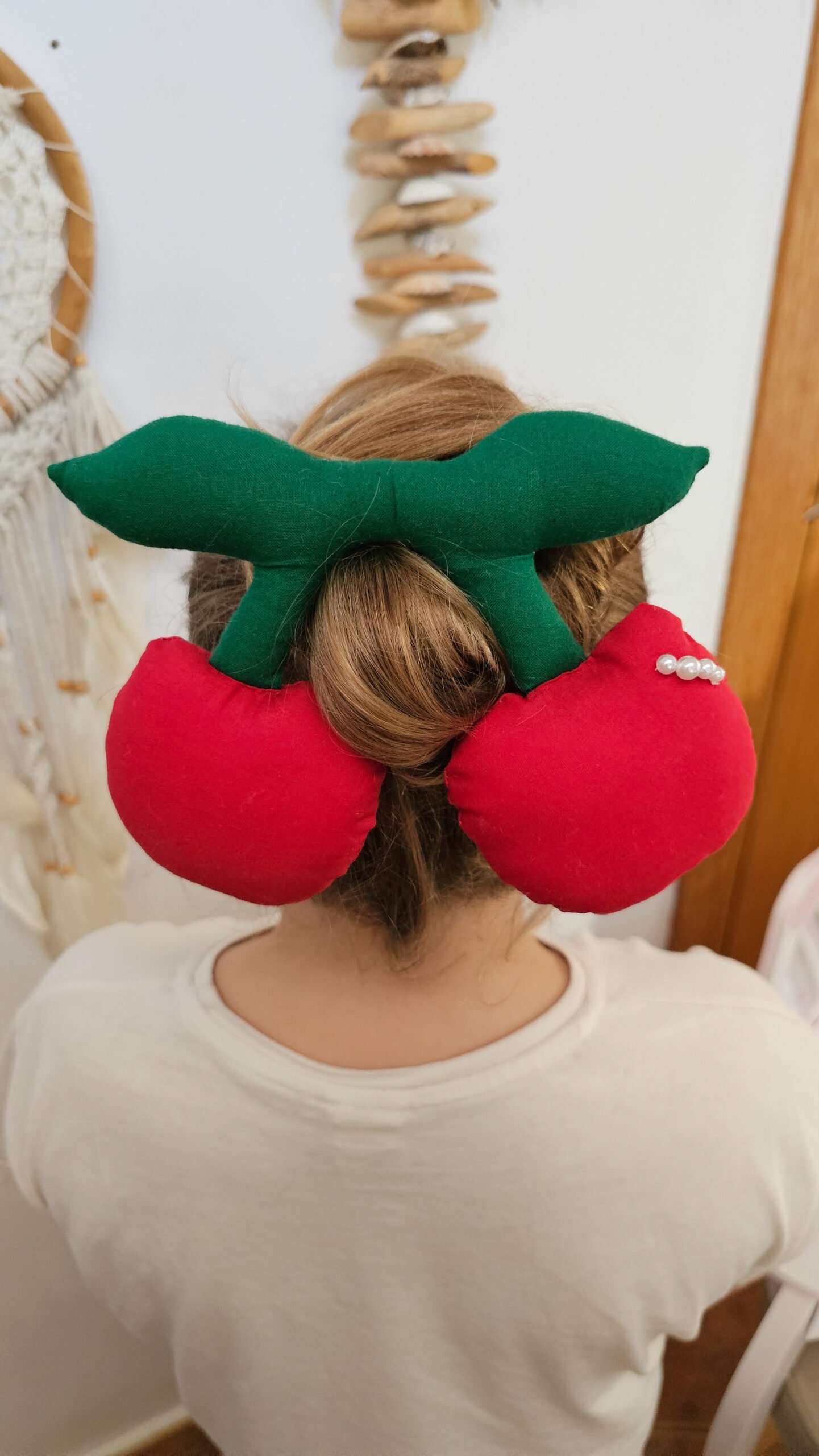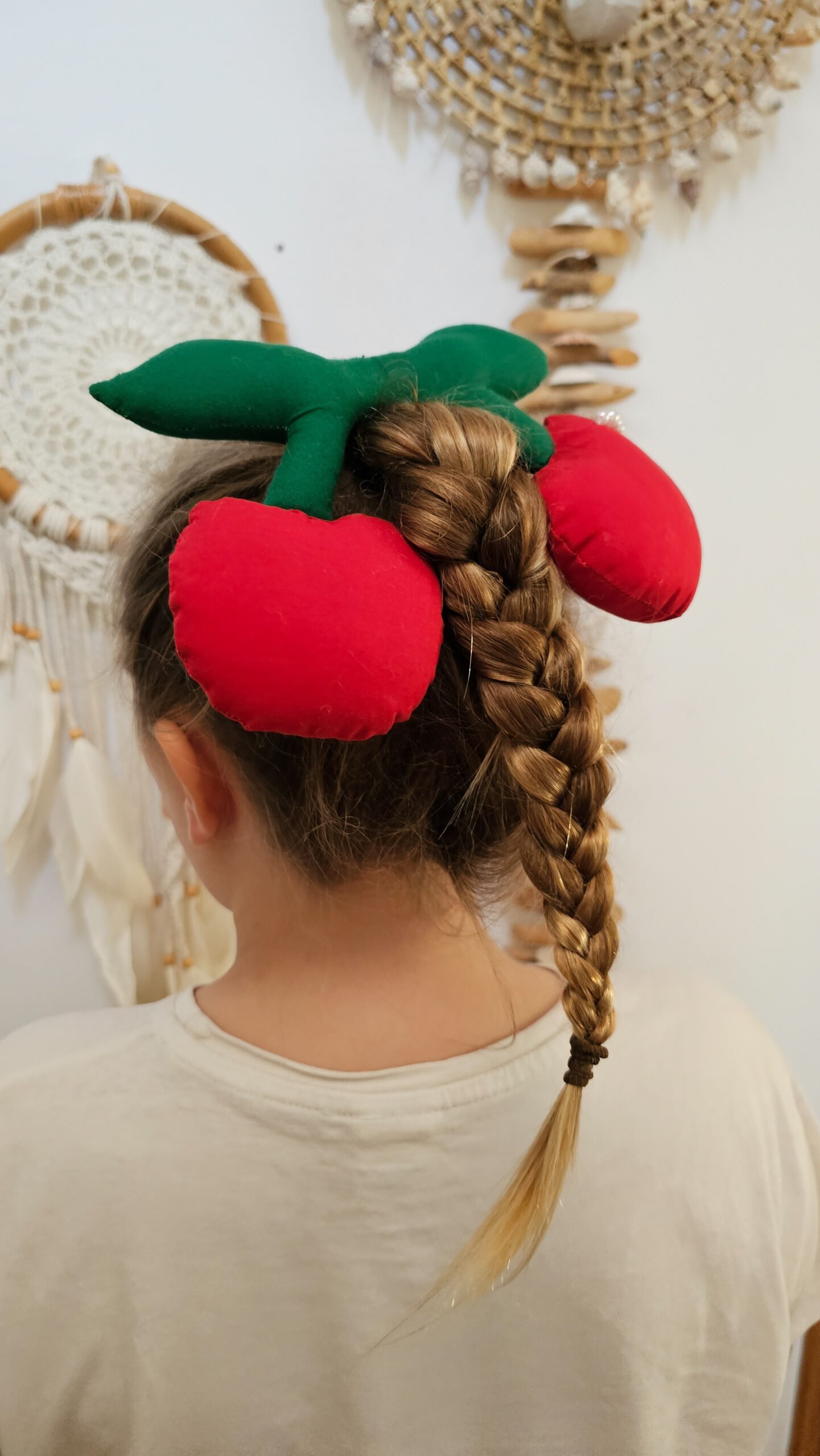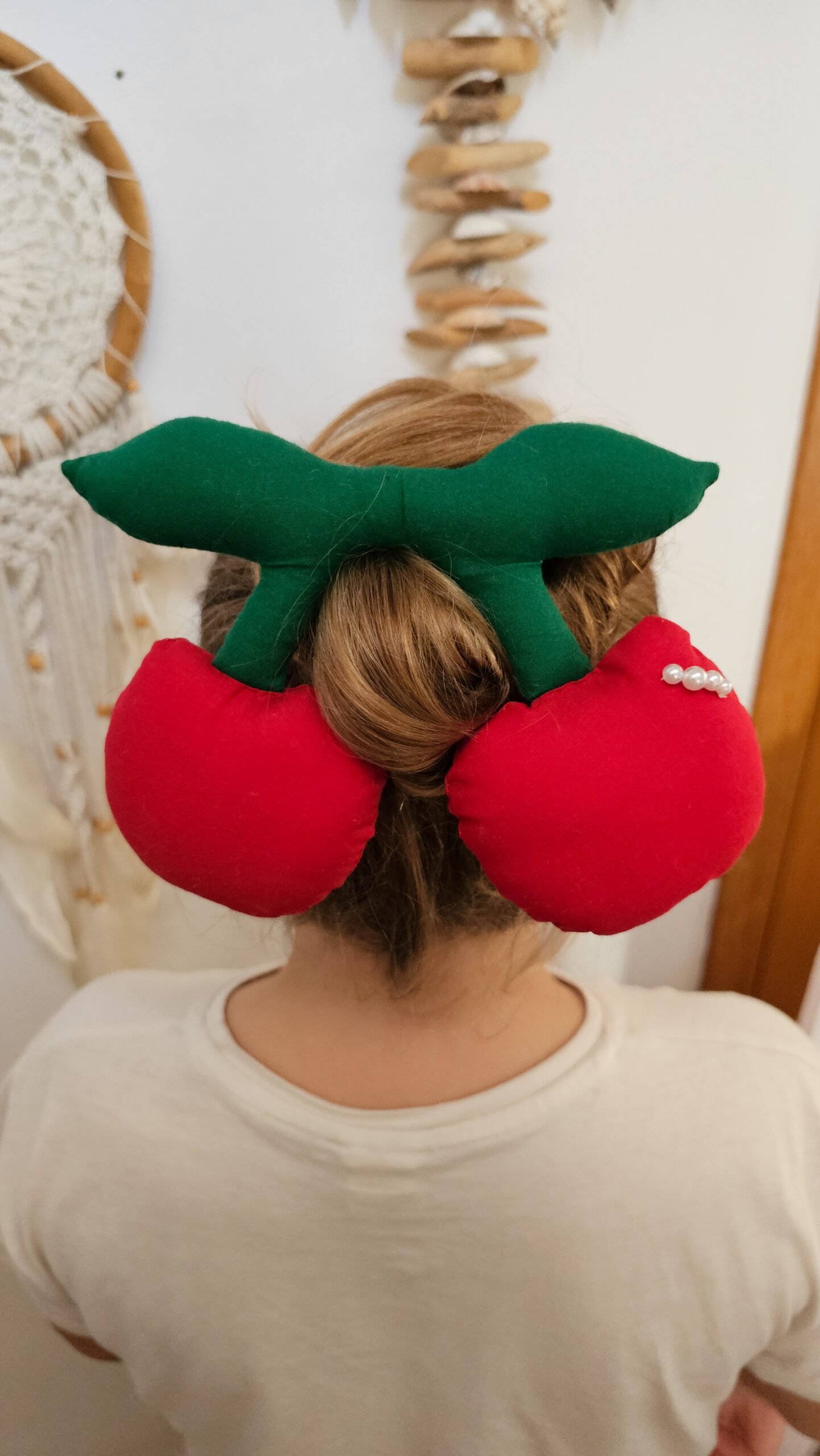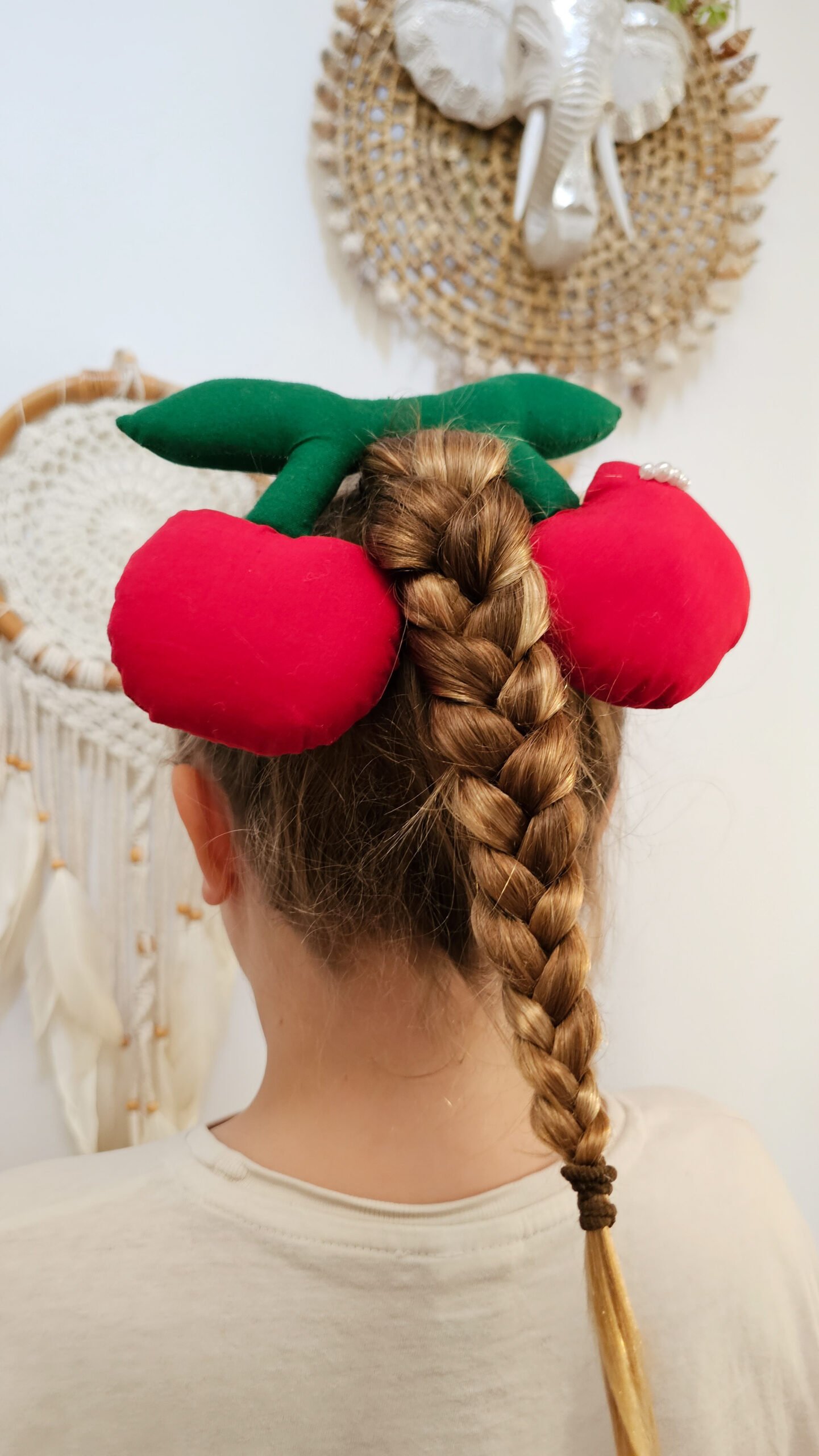 Ces élastiques pour cheveux en forme de paires de cerises sont une création originale, imaginée, dessinée et entièrement fabriquée par mes soins. Chaque détail a été pensé avec amour : les cerises rouges, la queue et les feuilles vertes, le tout confectionné dans un tissu soigneusement choisi, puis rembourré de mousse pour apporter du volume, de la tenue et un joli bombé à la coiffure.