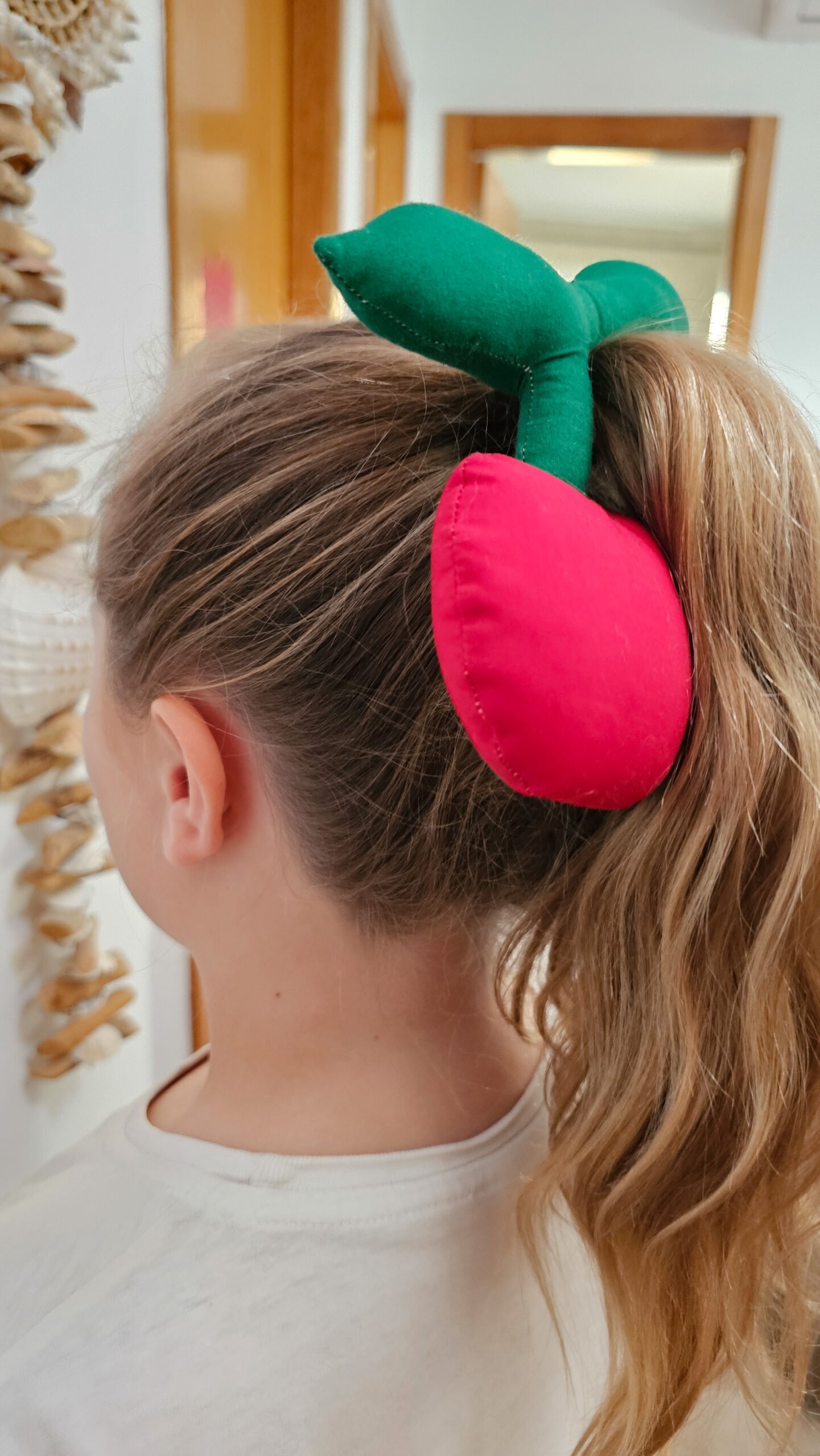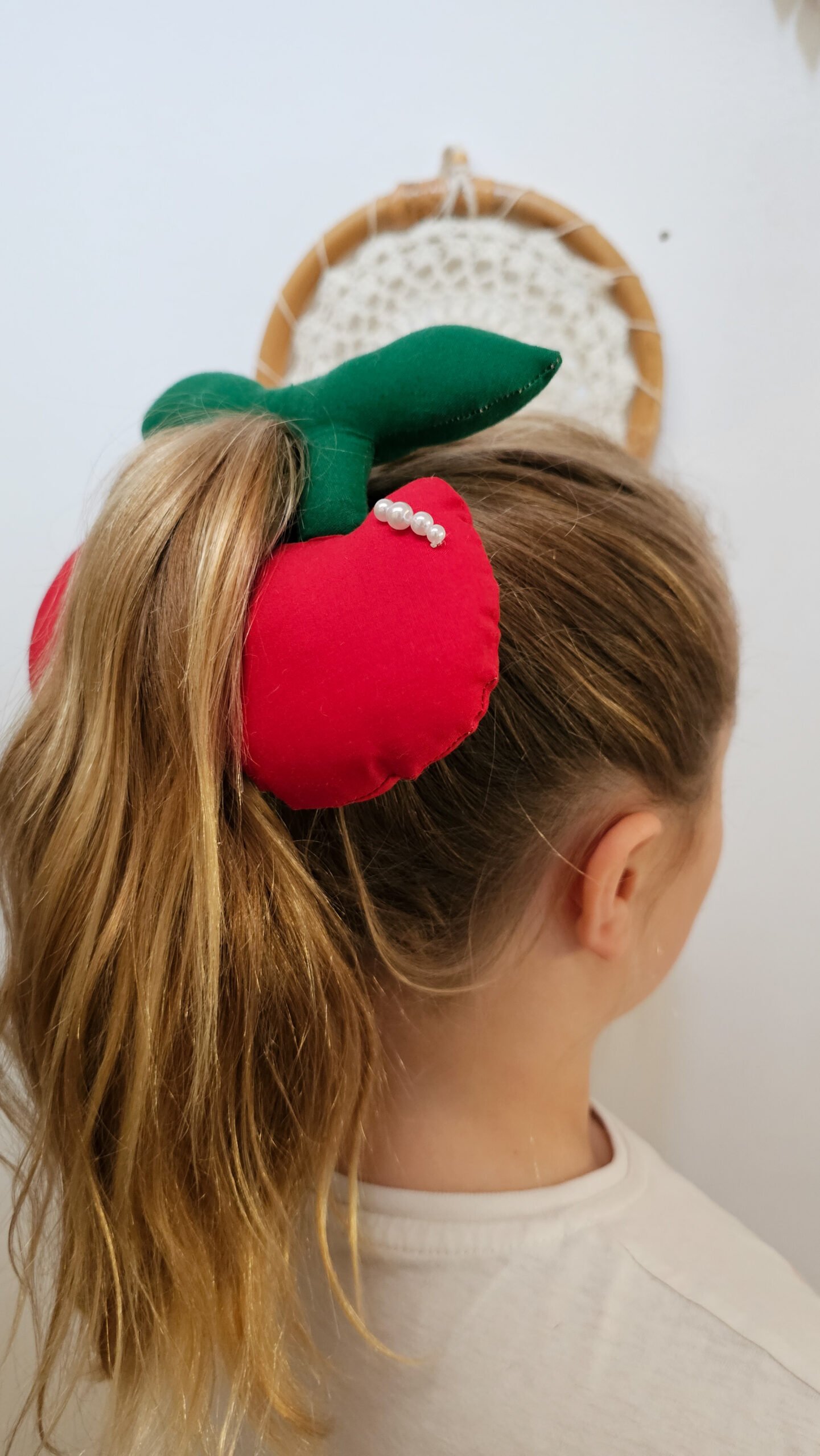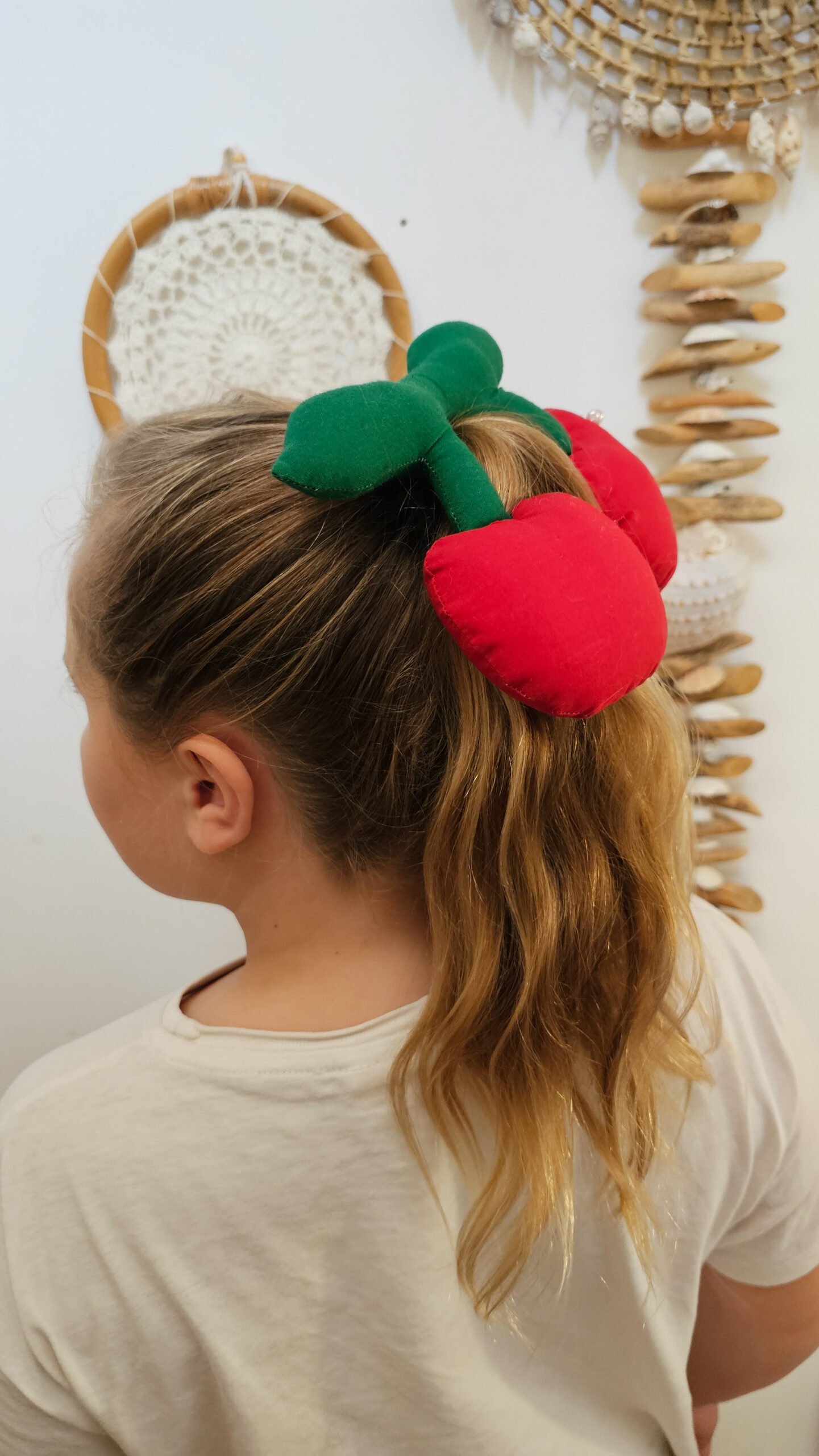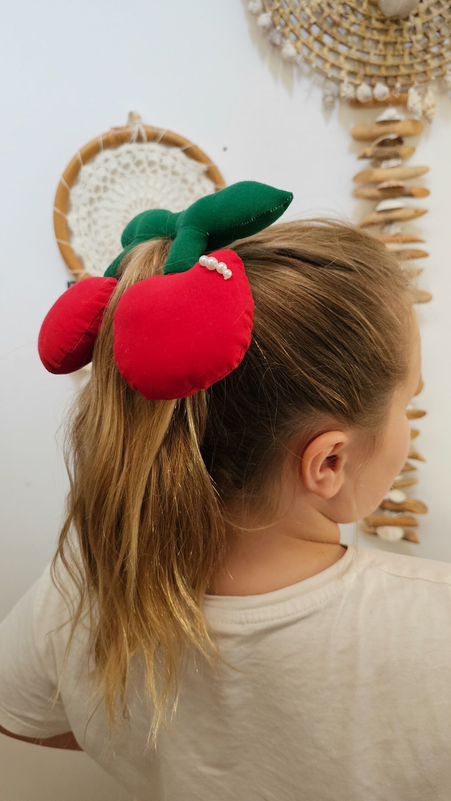 Ces élastiques pour cheveux en forme de paires de cerises sont une création originale, imaginée, dessinée et entièrement fabriquée par mes soins. Chaque détail a été pensé avec amour : les cerises rouges, la queue et les feuilles vertes, le tout confectionné dans un tissu soigneusement choisi, puis rembourré de mousse pour apporter du volume, de la tenue et un joli bombé à la coiffure.