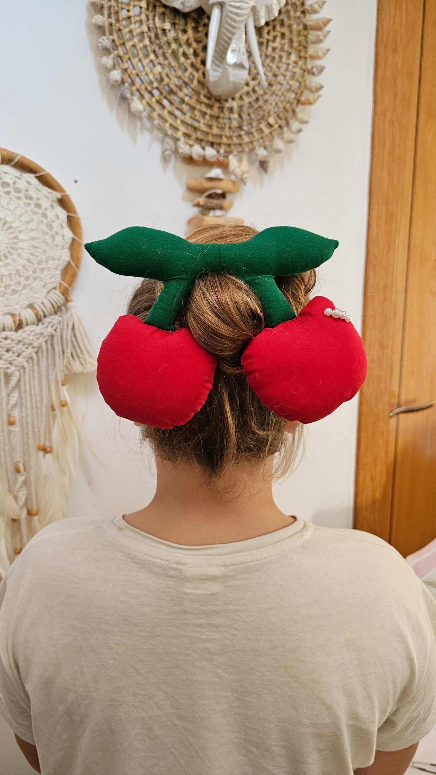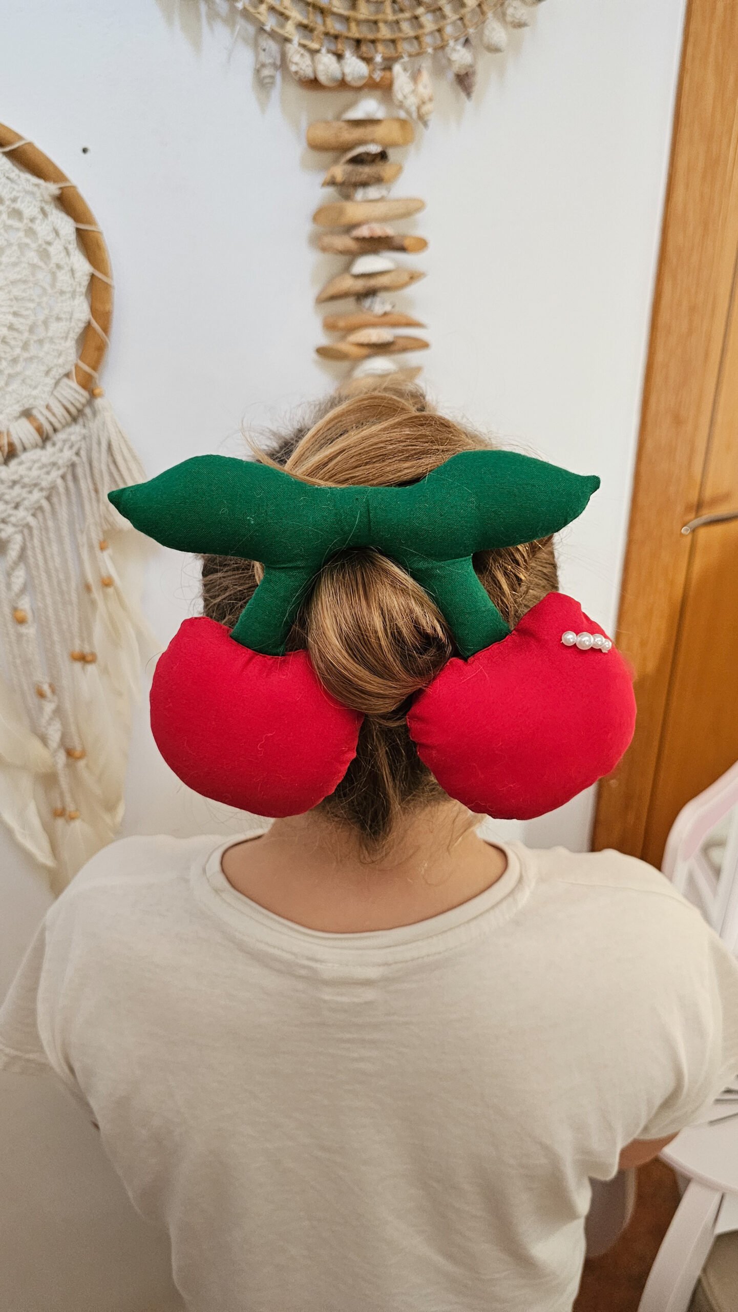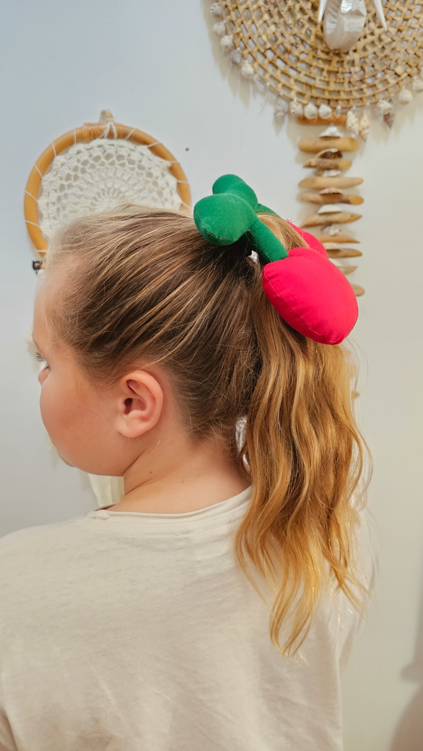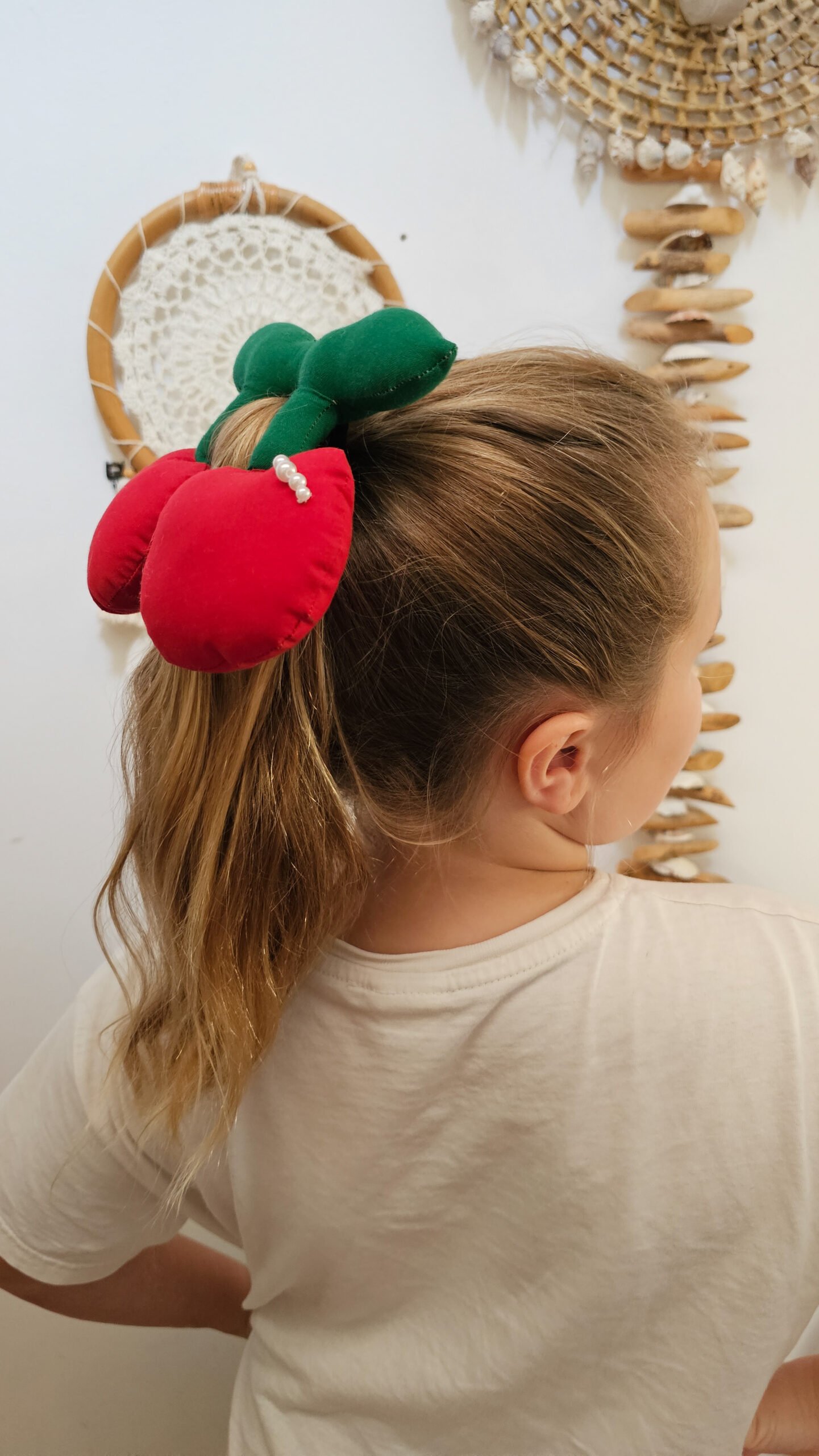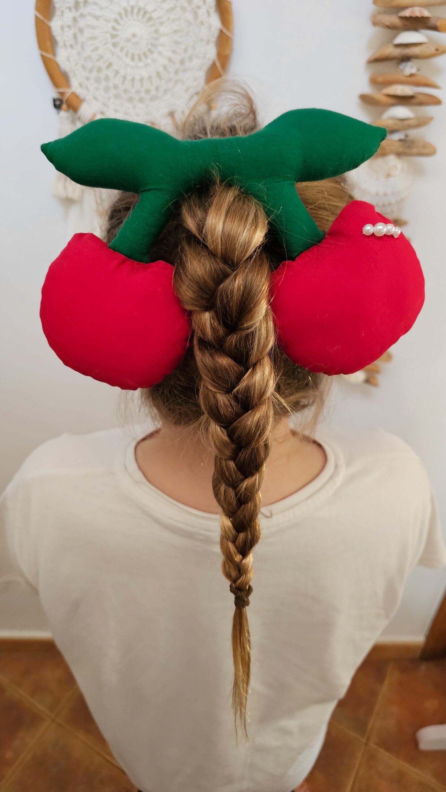 Ces élastiques pour cheveux en forme de paires de cerises sont une création originale, imaginée, dessinée et entièrement fabriquée par mes soins. Chaque détail a été pensé avec amour : les cerises rouges, la queue et les feuilles vertes, le tout confectionné dans un tissu soigneusement choisi, puis rembourré de mousse pour apporter du volume, de la tenue et un joli bombé à la coiffure.