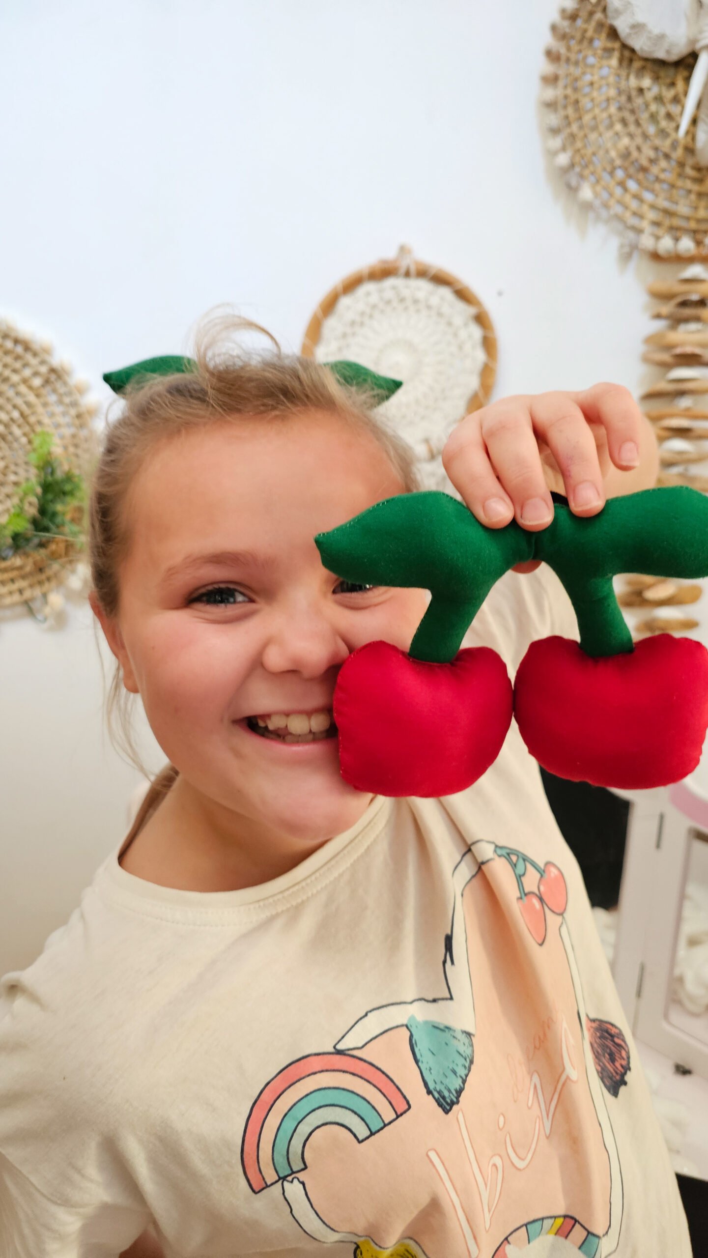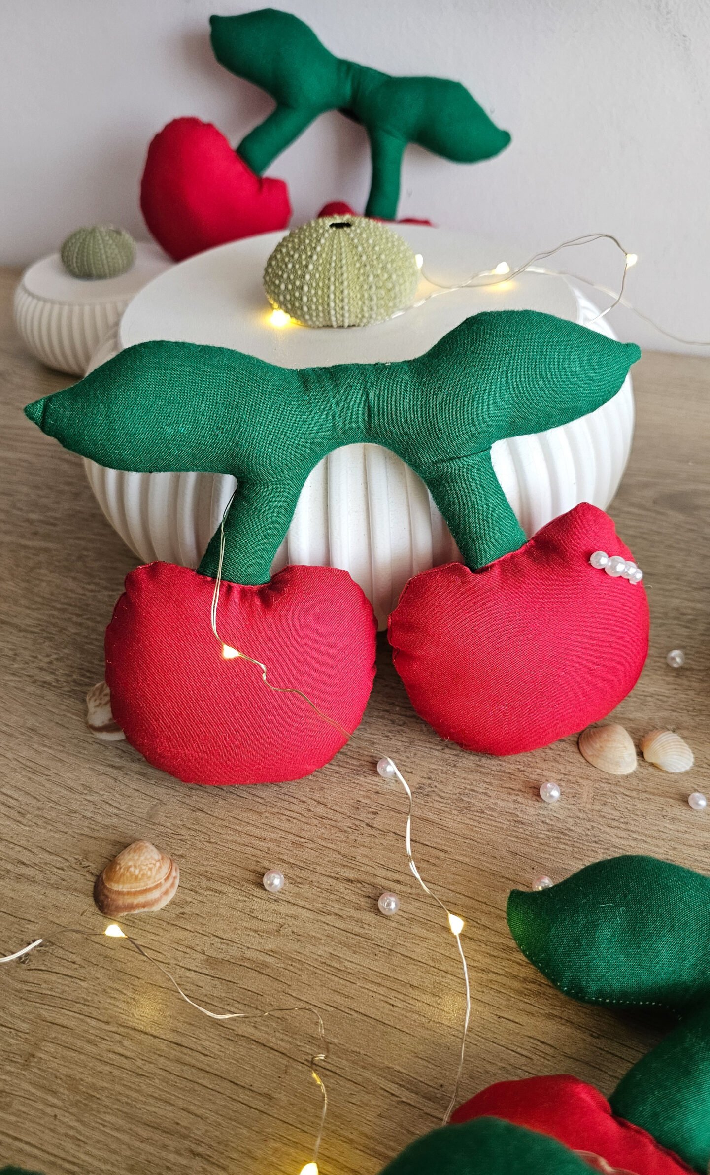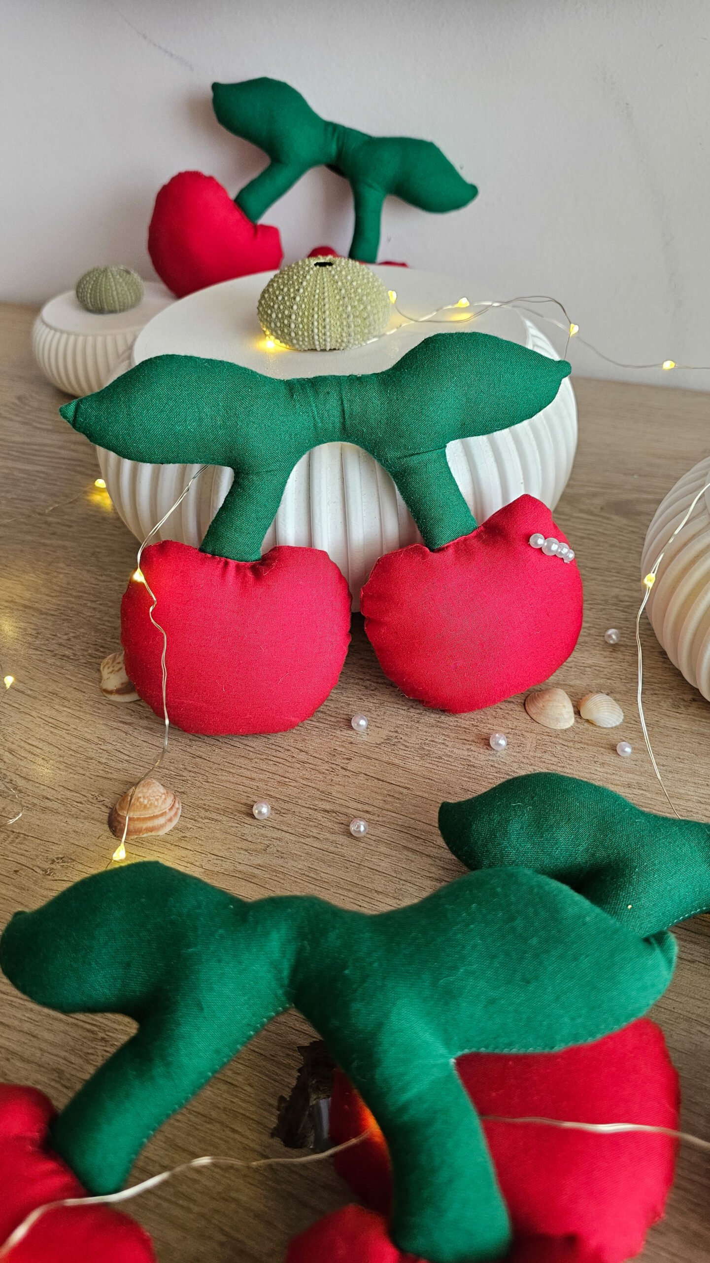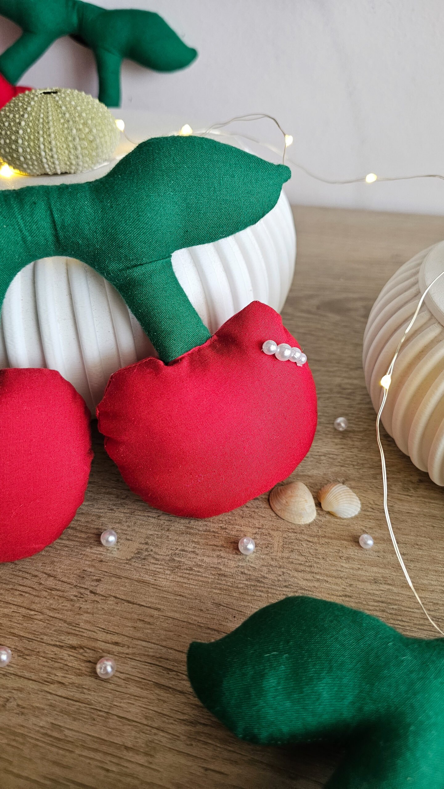 une version légèrement plus travaillée, toujours dans le même tissu, avec 3 à 4 perles blanches nacrées délicatement fixées sur la cerise de droite, directement sur la boule rouge, pour une touche lumineuse et raffinée.