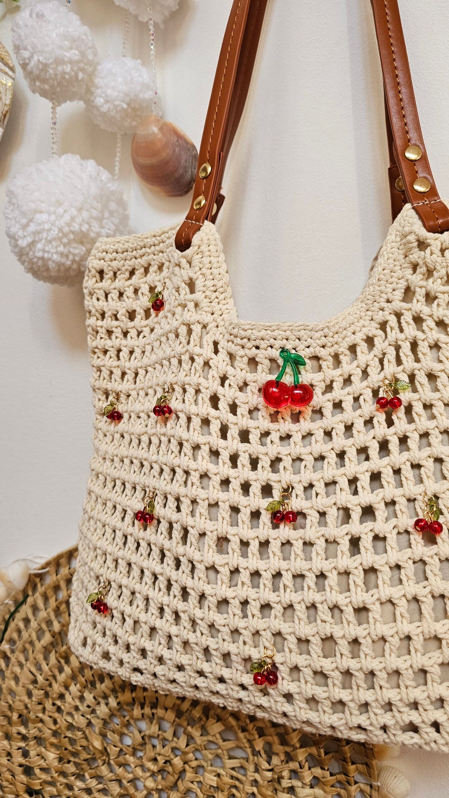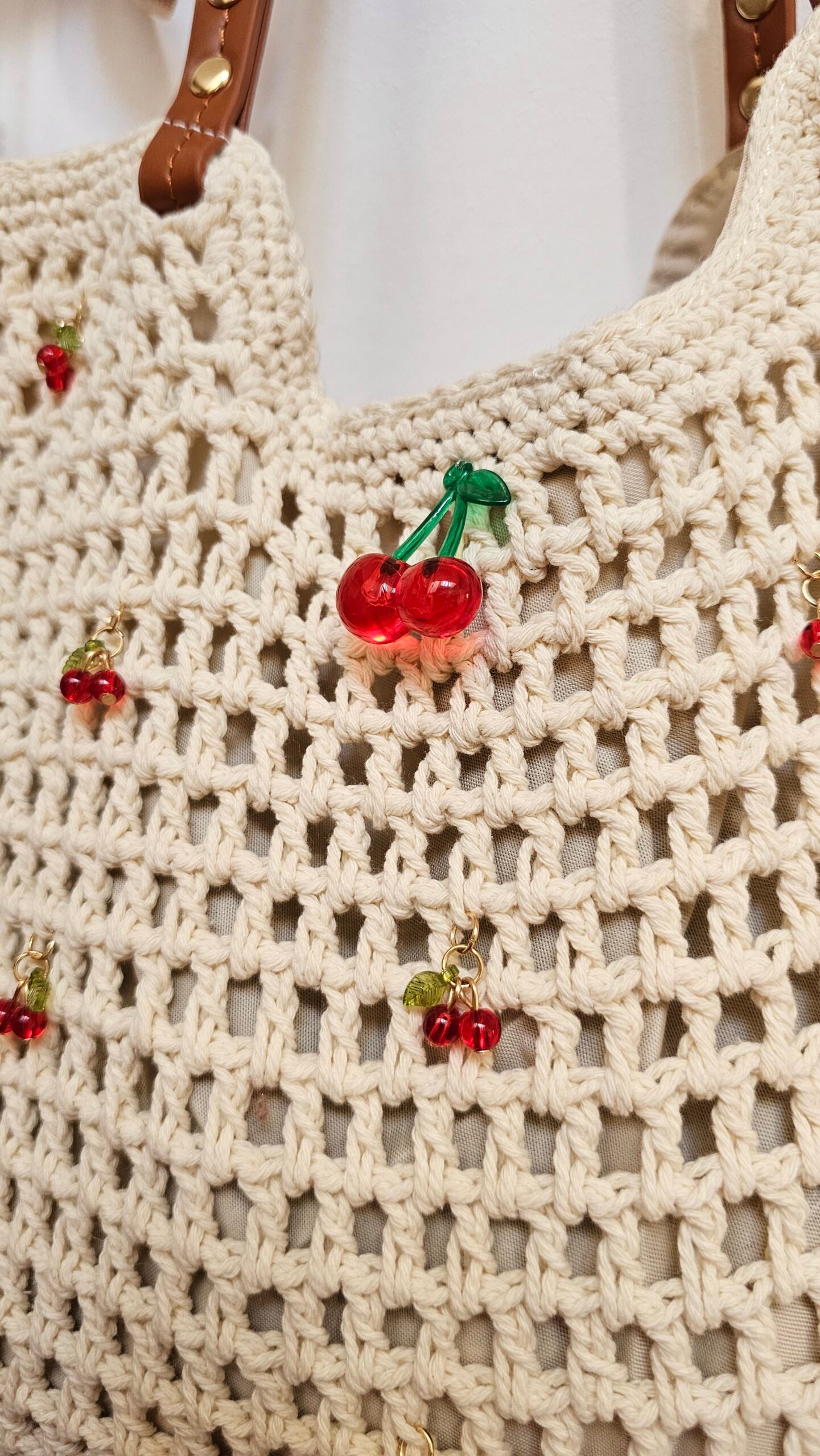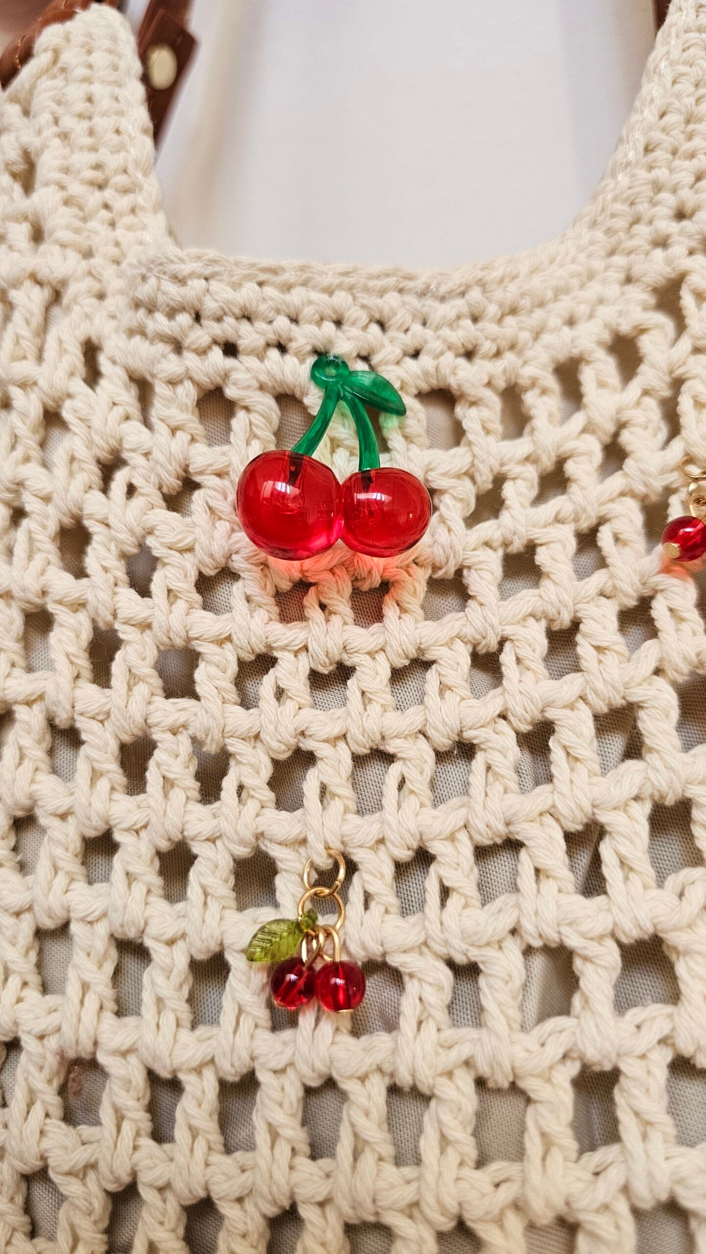 Ce sac est décoré de cerises dont celle du milieu en cerise transparente