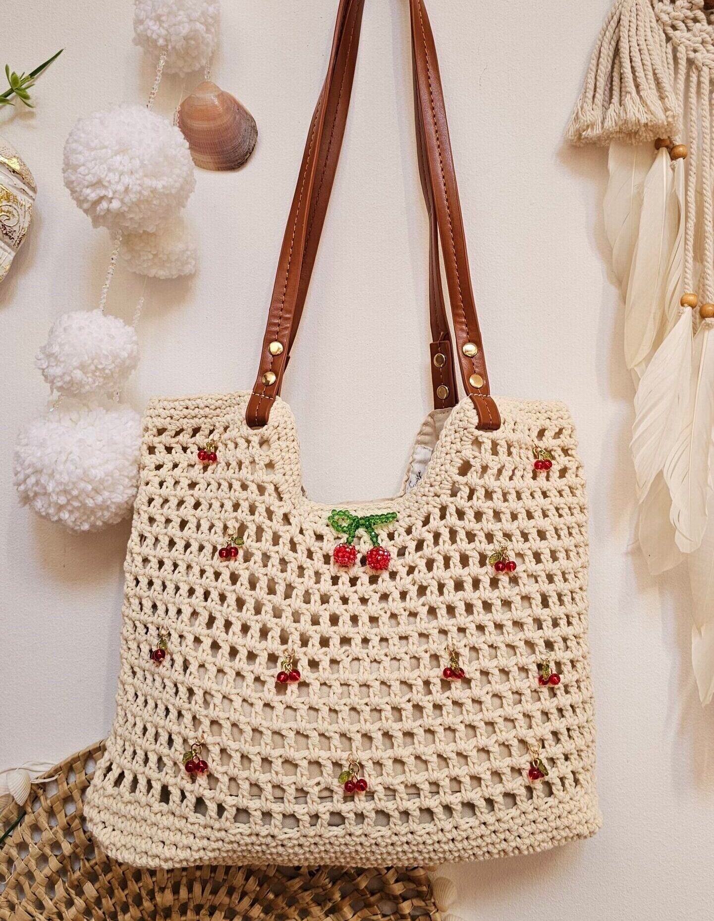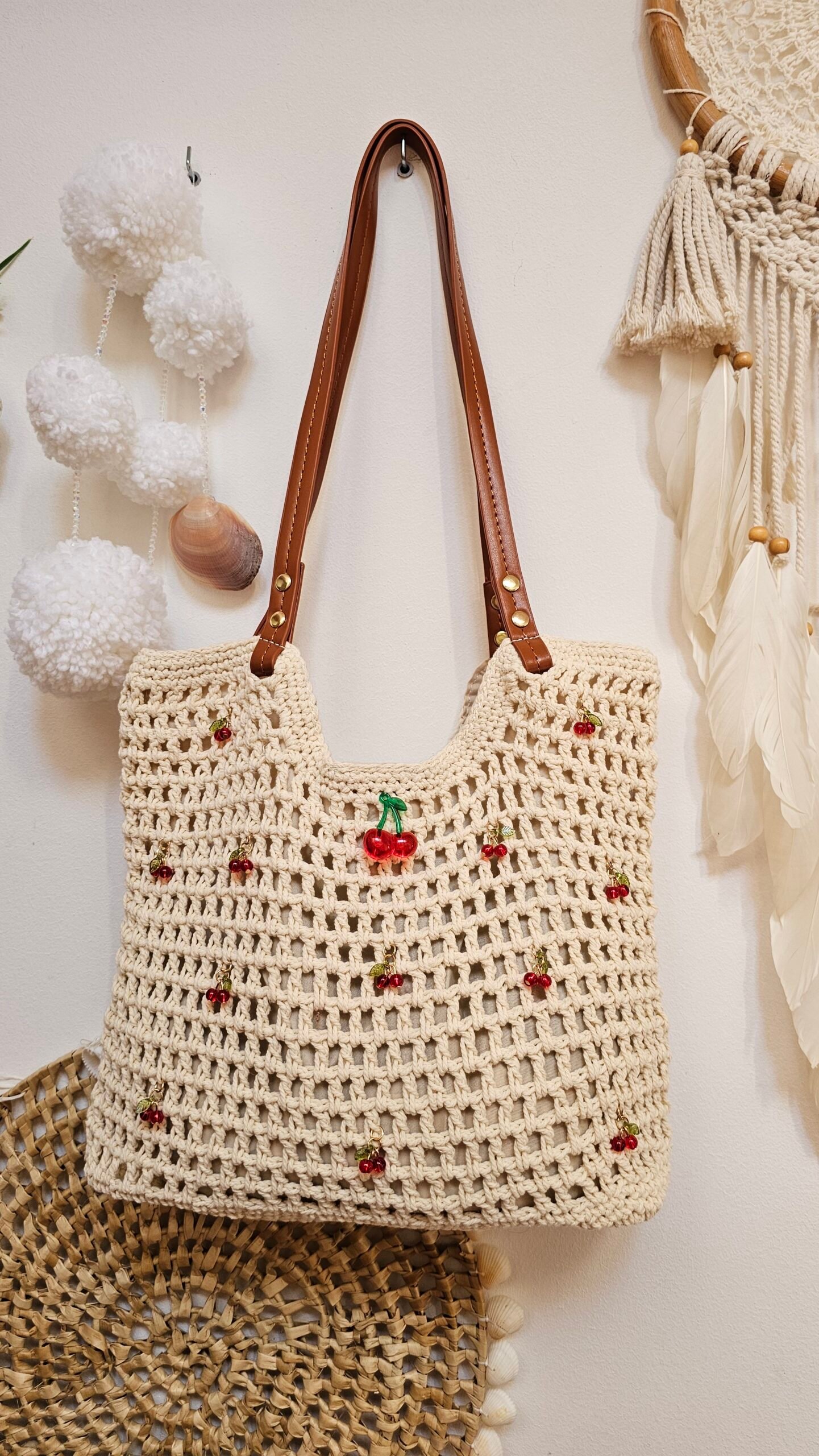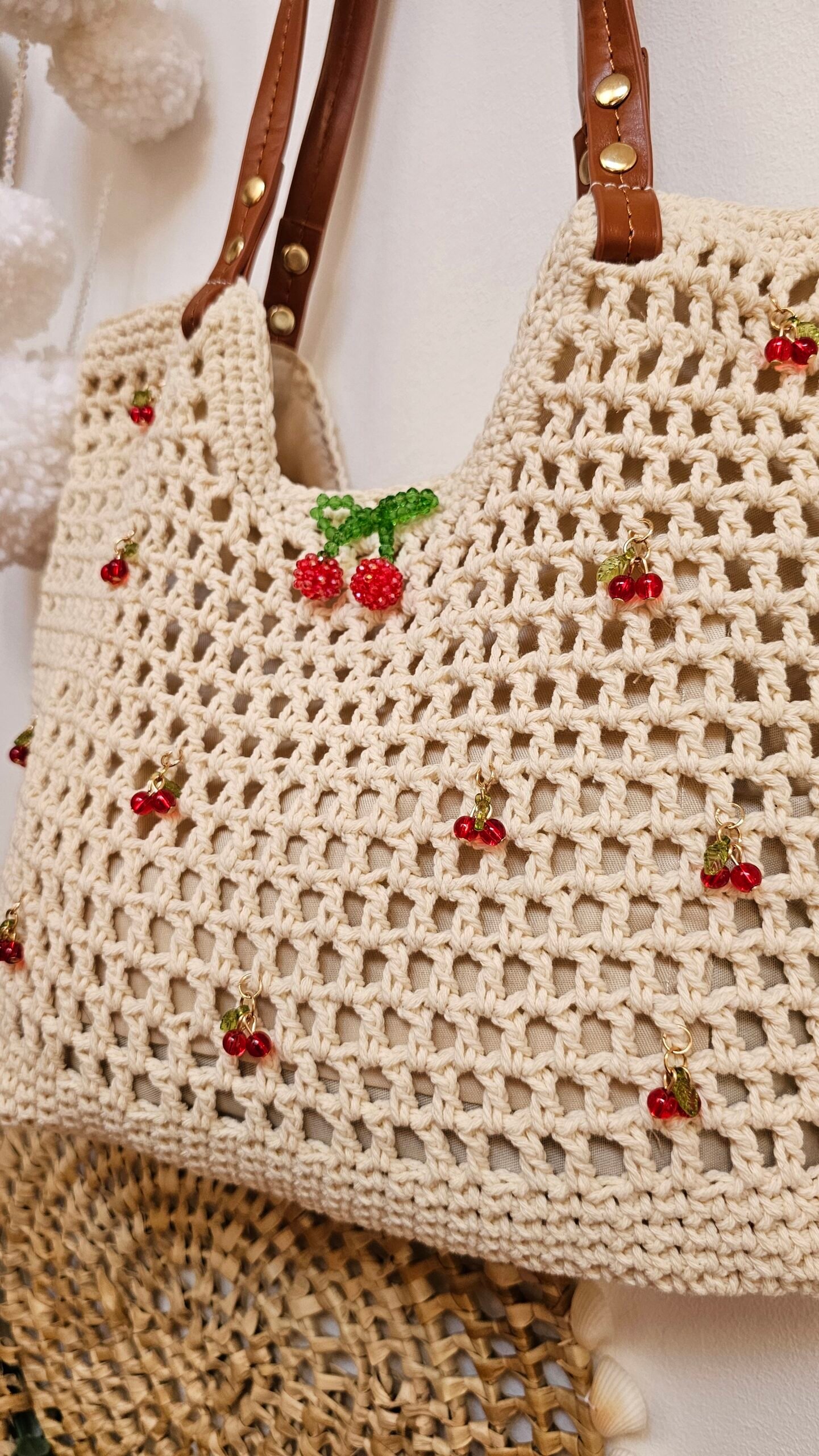Ce sac est décoré de cerises dont celle du milieu en cerise transparente