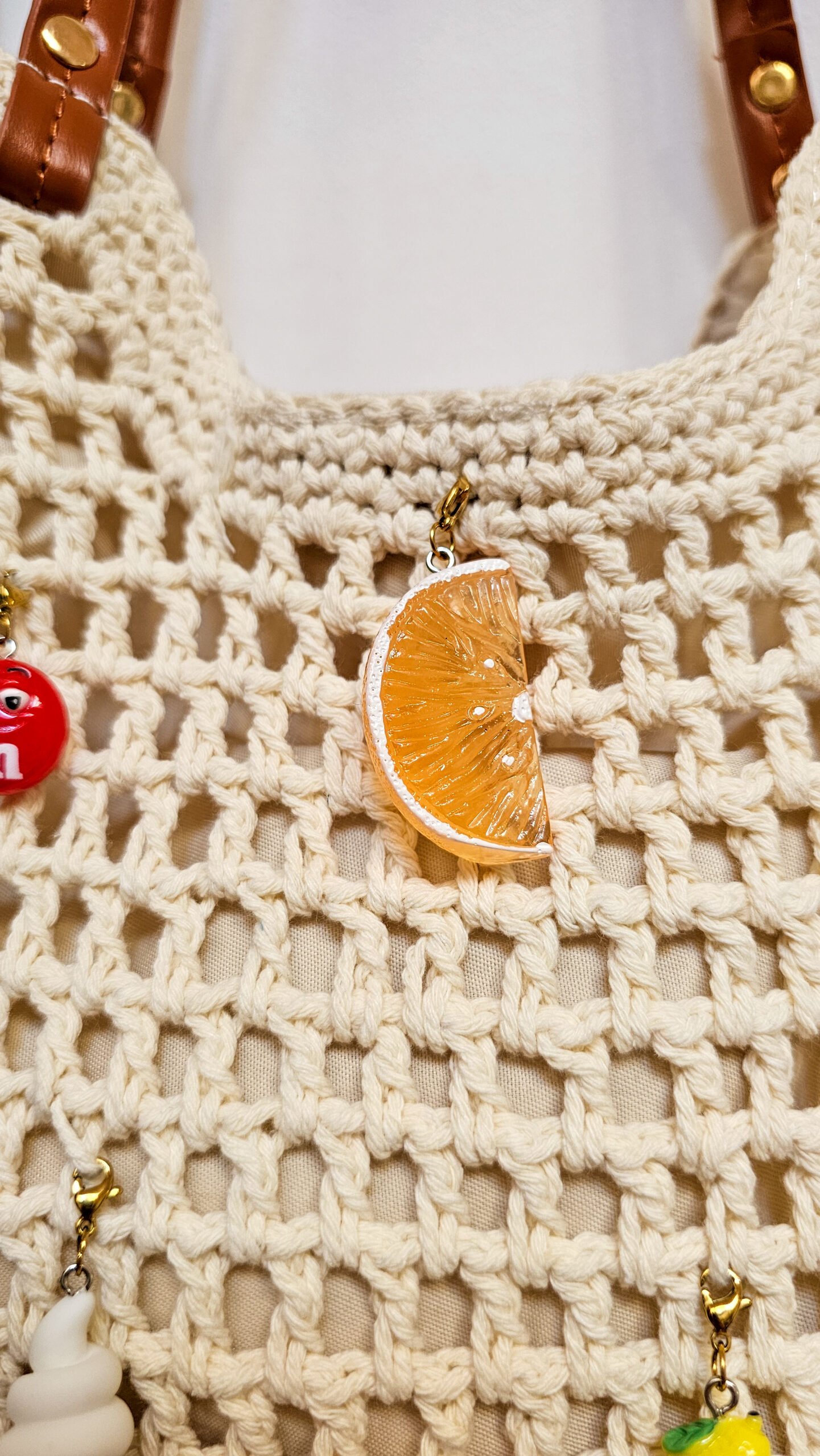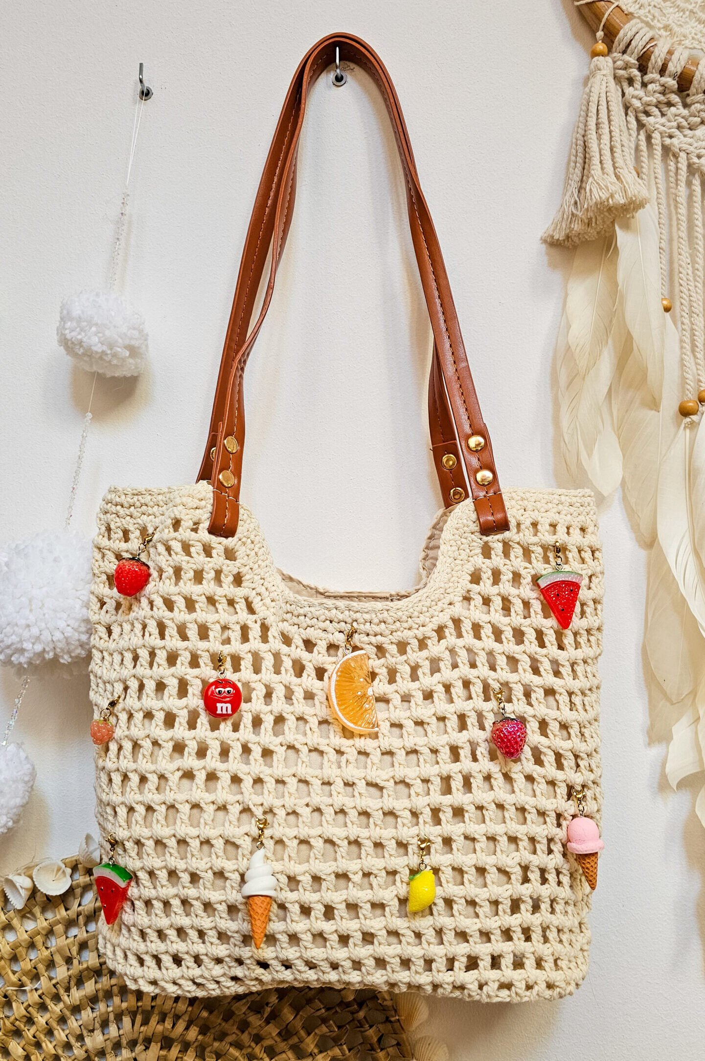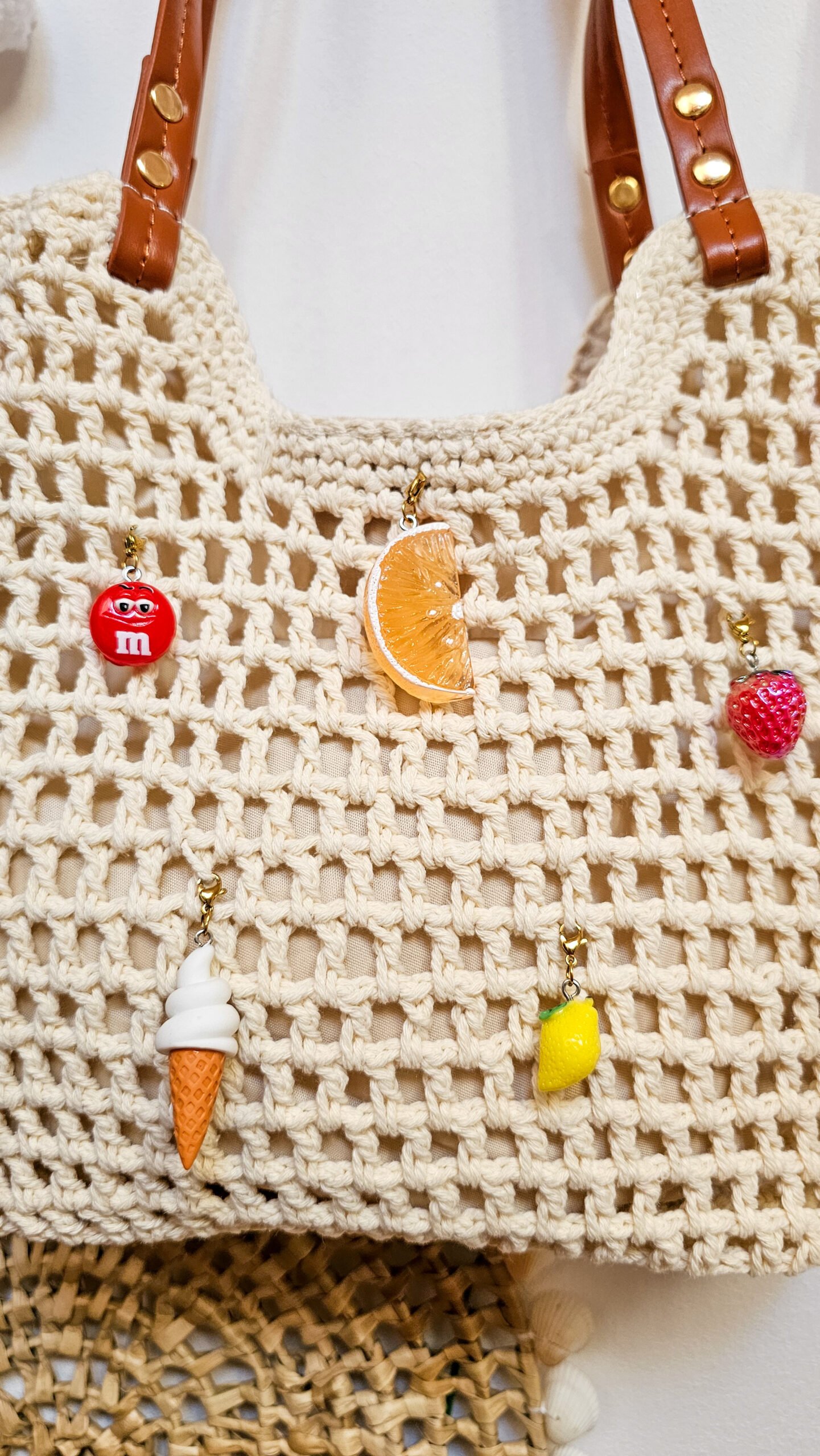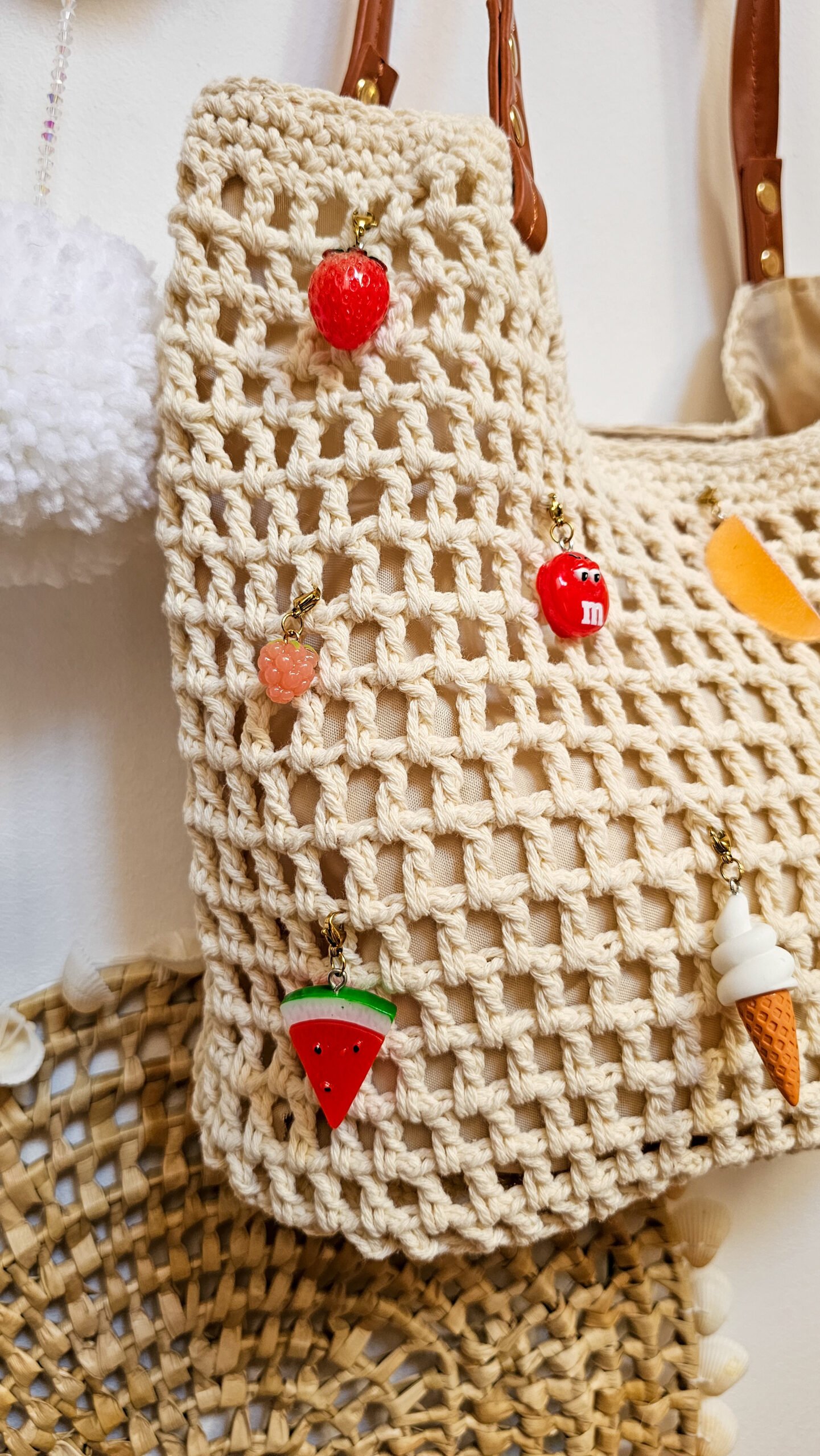 🍓🍦 Sac en crochet fait main à Ibiza, décoré de breloques gourmandes pour un look fun et estival. Fermeture aimantée + pochette zippée pour vos essentiels. Une pièce unique qui sent bon les vacances 🌞