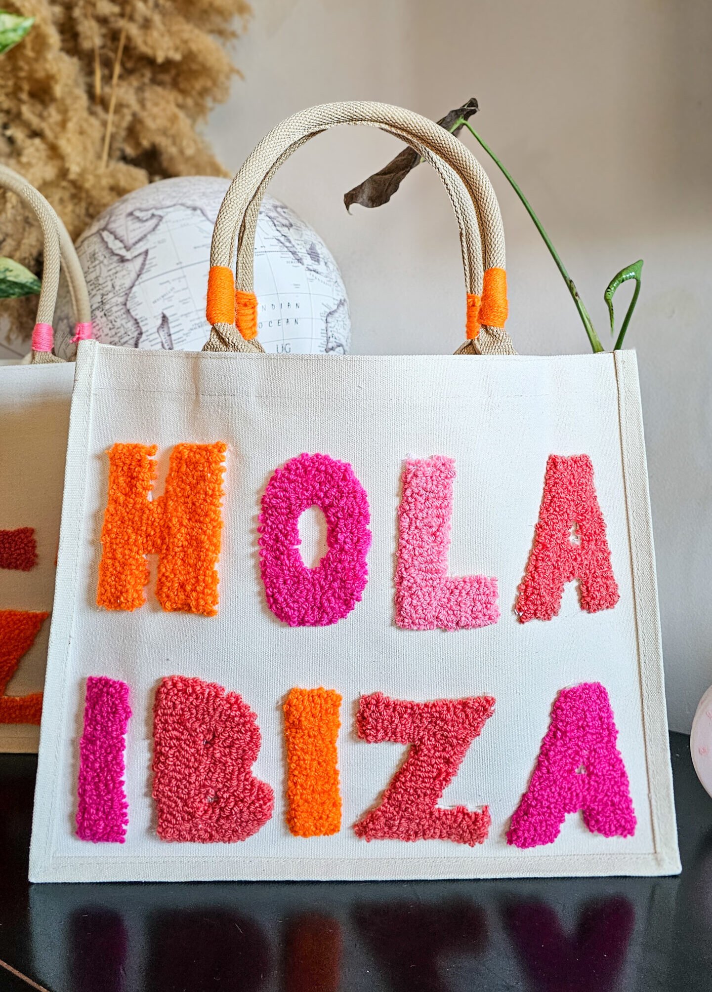 Sac artisanal en toile imperméabilisée, décoré de lettres fluffy et de détails en laine sur les anses. Élégance et douceur made in Ibiza. 🌿💜