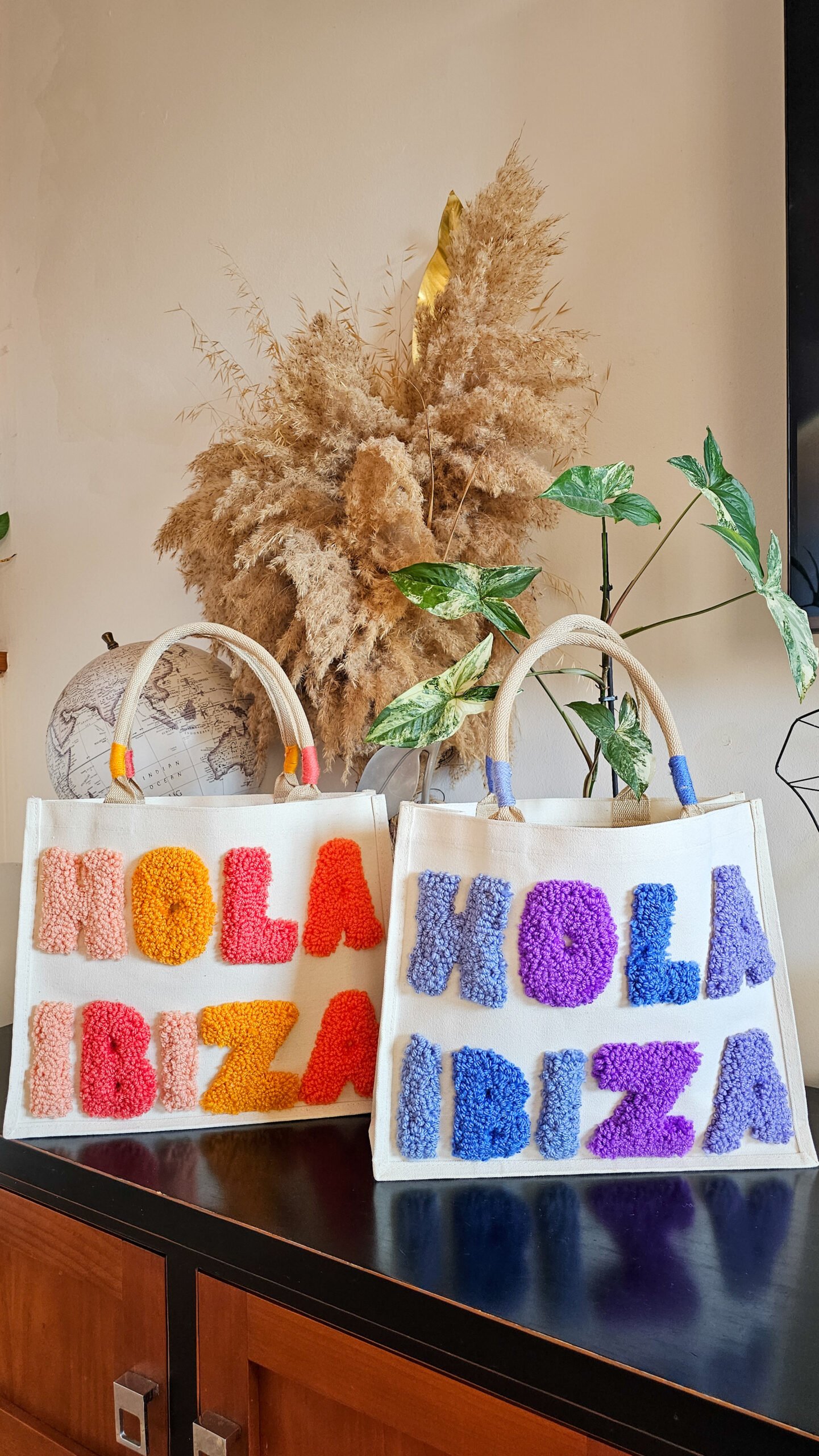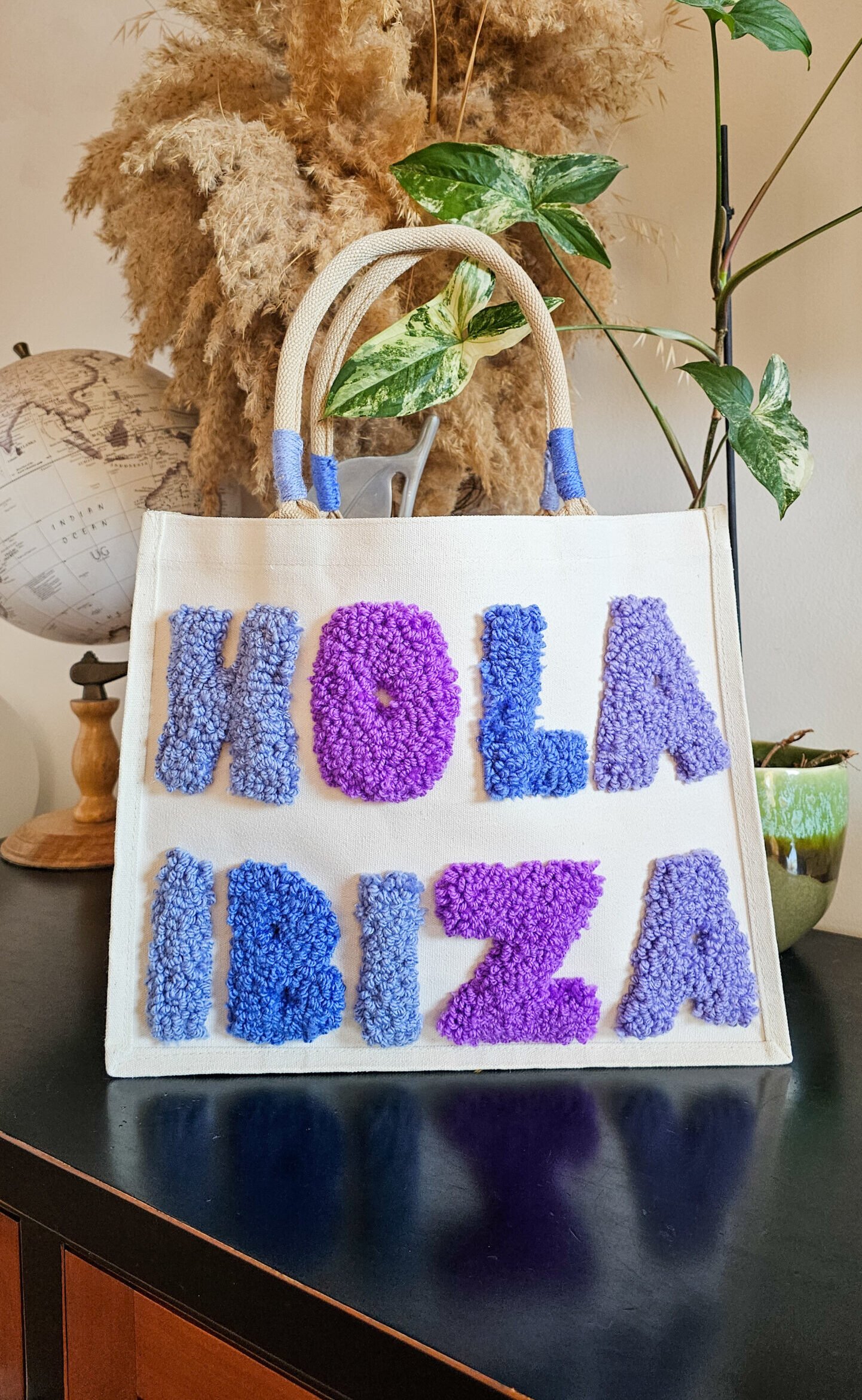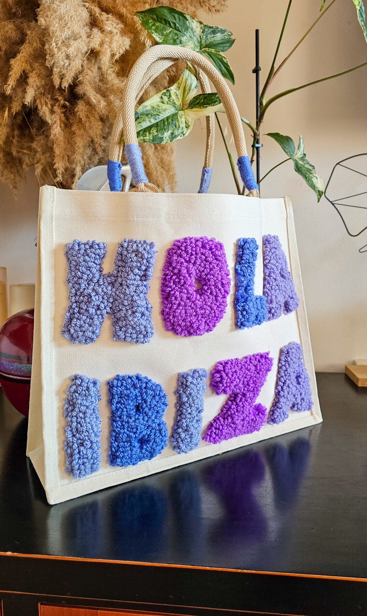 Ce sac en toile punch needle est bien plus qu’un accessoire : c’est une signature, un look affirmé, solaire et ultra stylé, directement inspiré de l’âme d’Ibiza. Sa teinte violine et son lettrage artisanal en font une pièce rare, que l’on ne croise pas partout !!