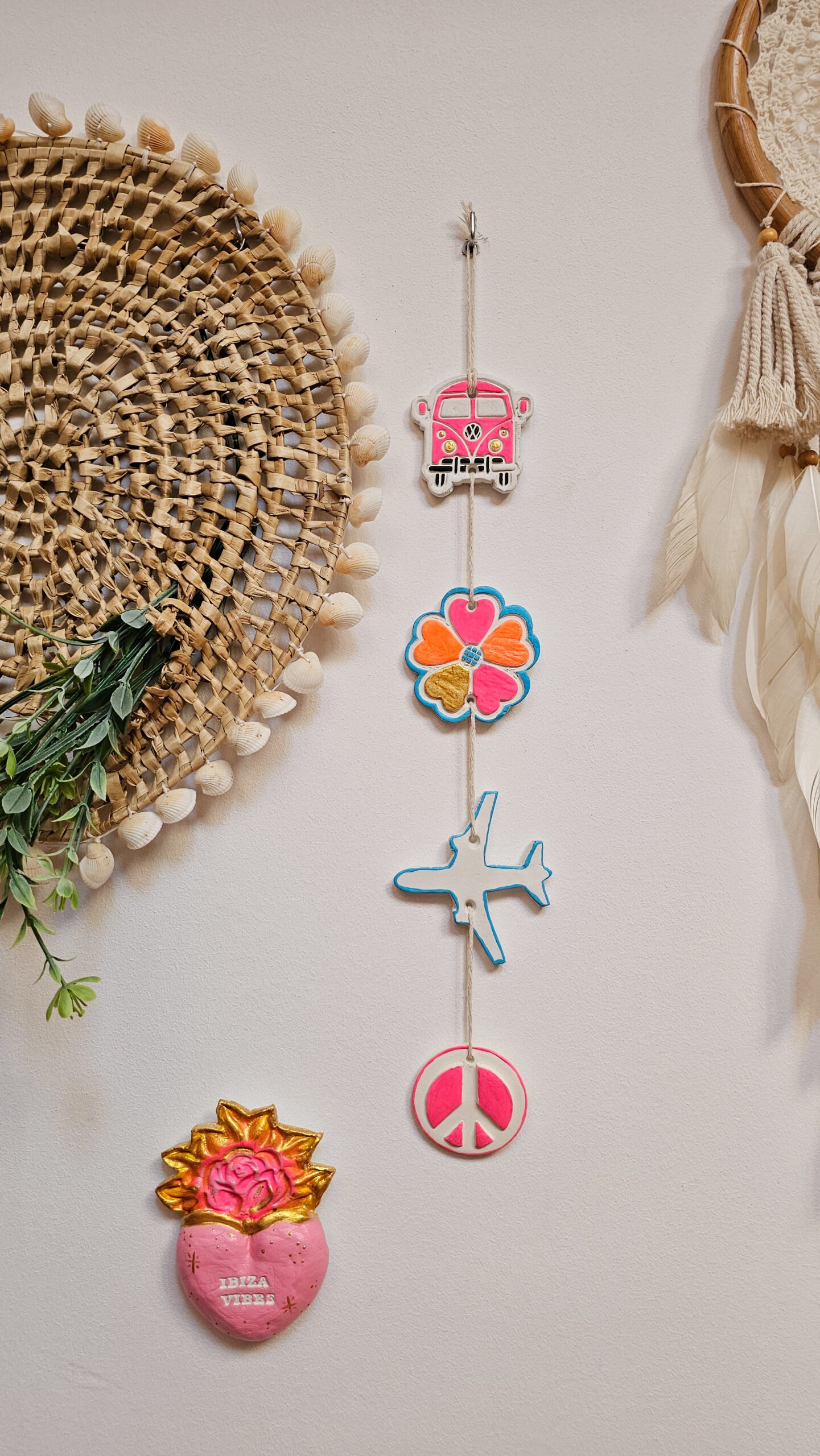 Fabriquées et peintes à la main dans mon atelier à Ibiza, ces suspensions murales en plâtre capturent l’esprit libre et bohème de l’île : vans hippies, silhouettes en maillot, santiags, fleurs, soleil, signe Peace and love…